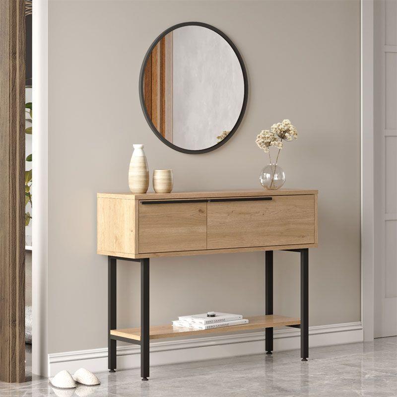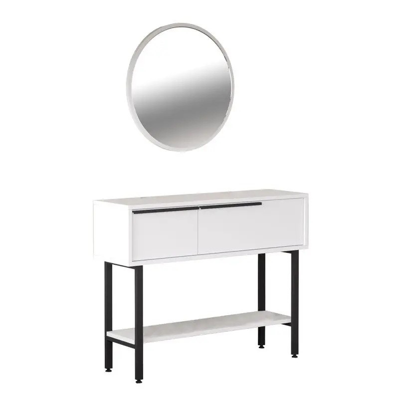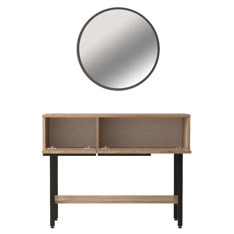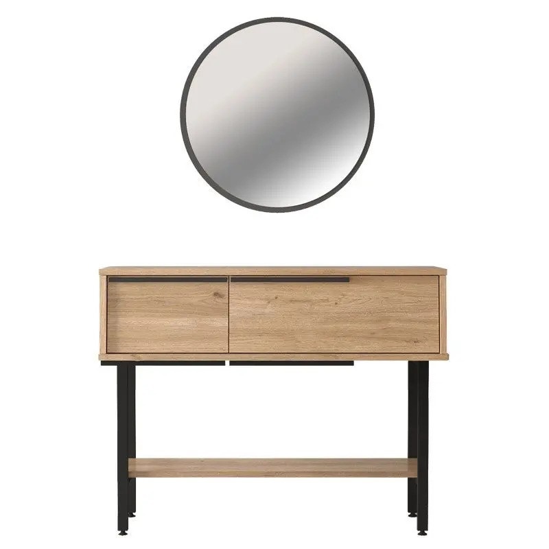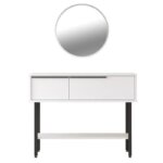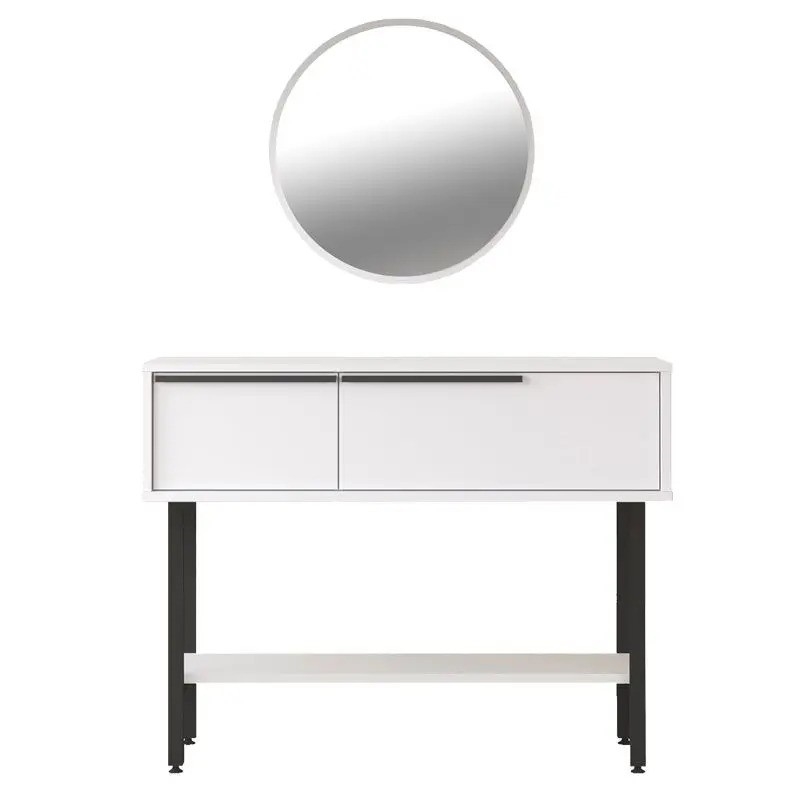 Стилна тоалетка с две чекмеджета за съхранение на лични вещи, долен рафт за аксесоари и кръгло огледало.
