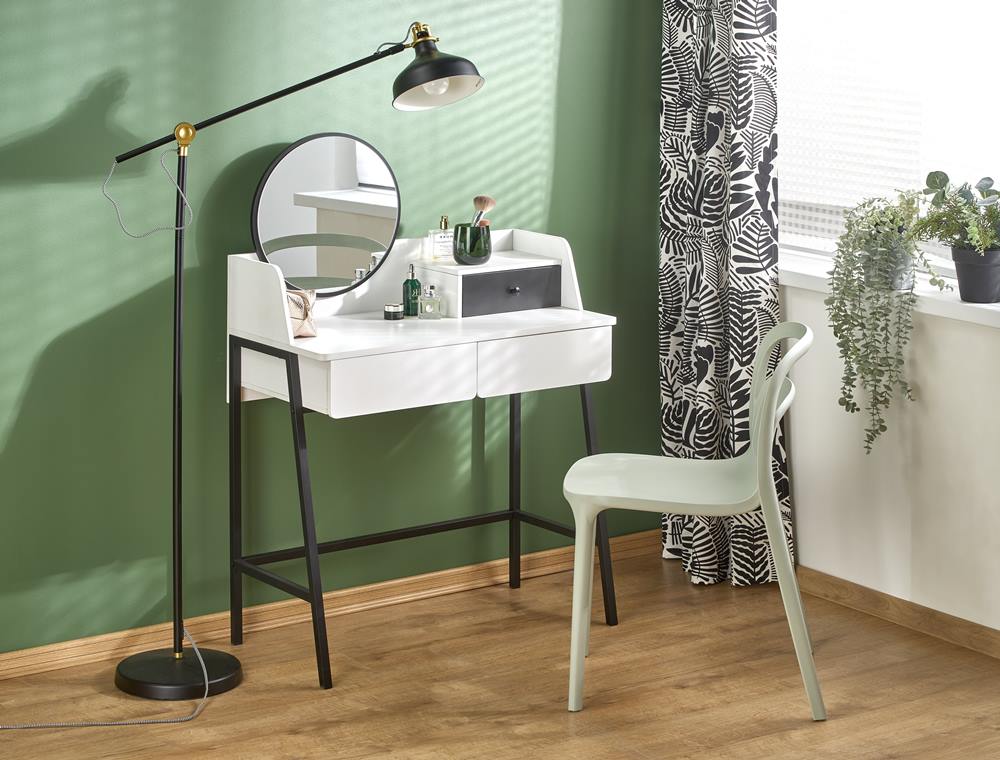 Тоалетка с две чекмеджета, рафт и огледало-бял, интериор