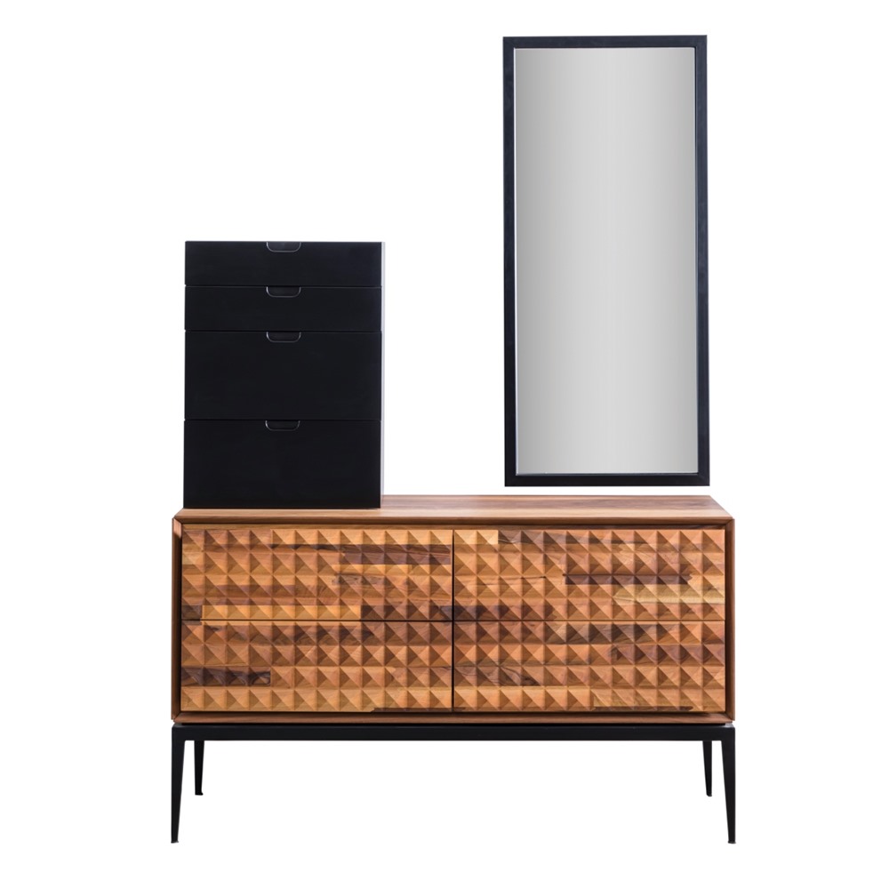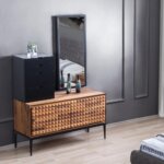 Тоалетка с чекмеджета, правоъгълно огледало и допълнителен модул за съхранение.