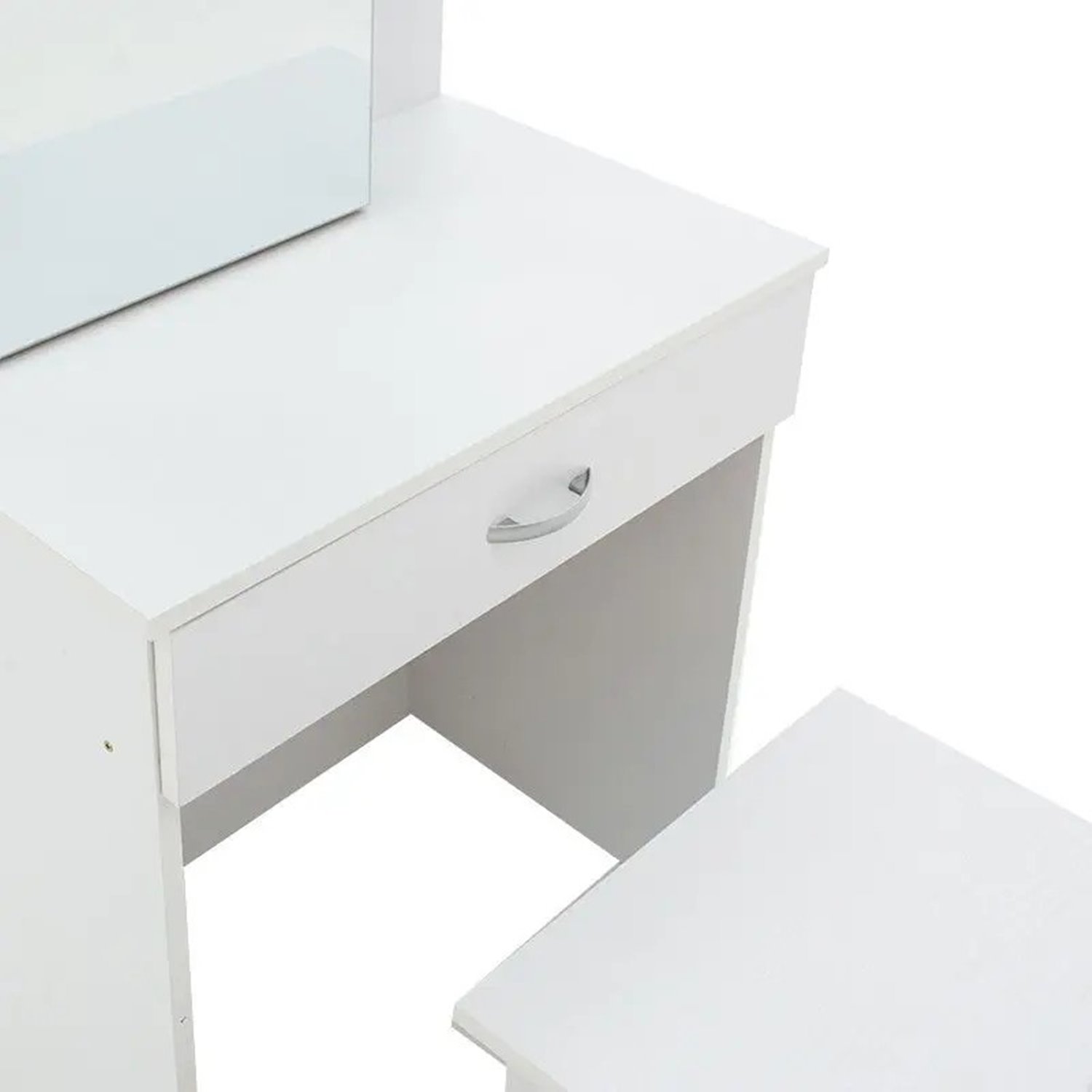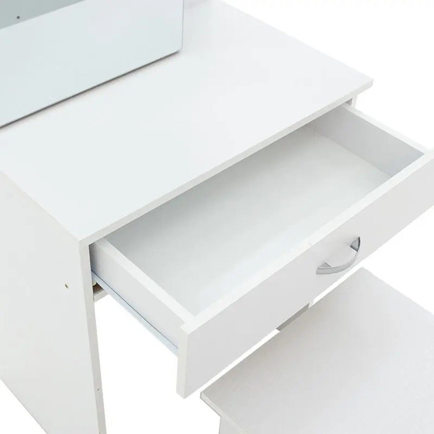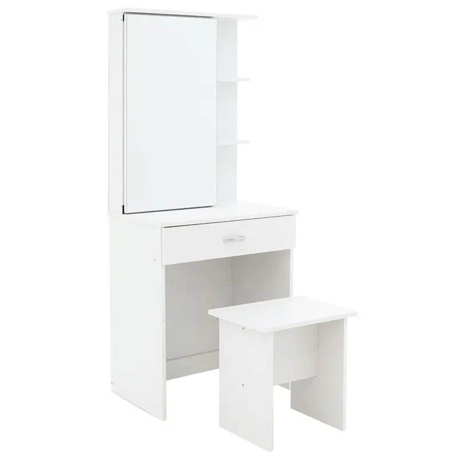 Тоалетка с огледало, два рафта и чекмедже-бял, табуретка