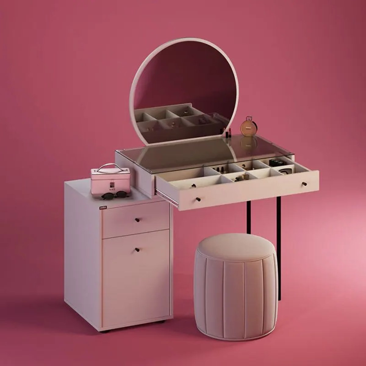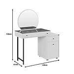 Предлага се в цвят млечно бяло и разполага с три чекмеджета, осигуряващи удобна организация и съхранение на вашите аксесоари.