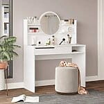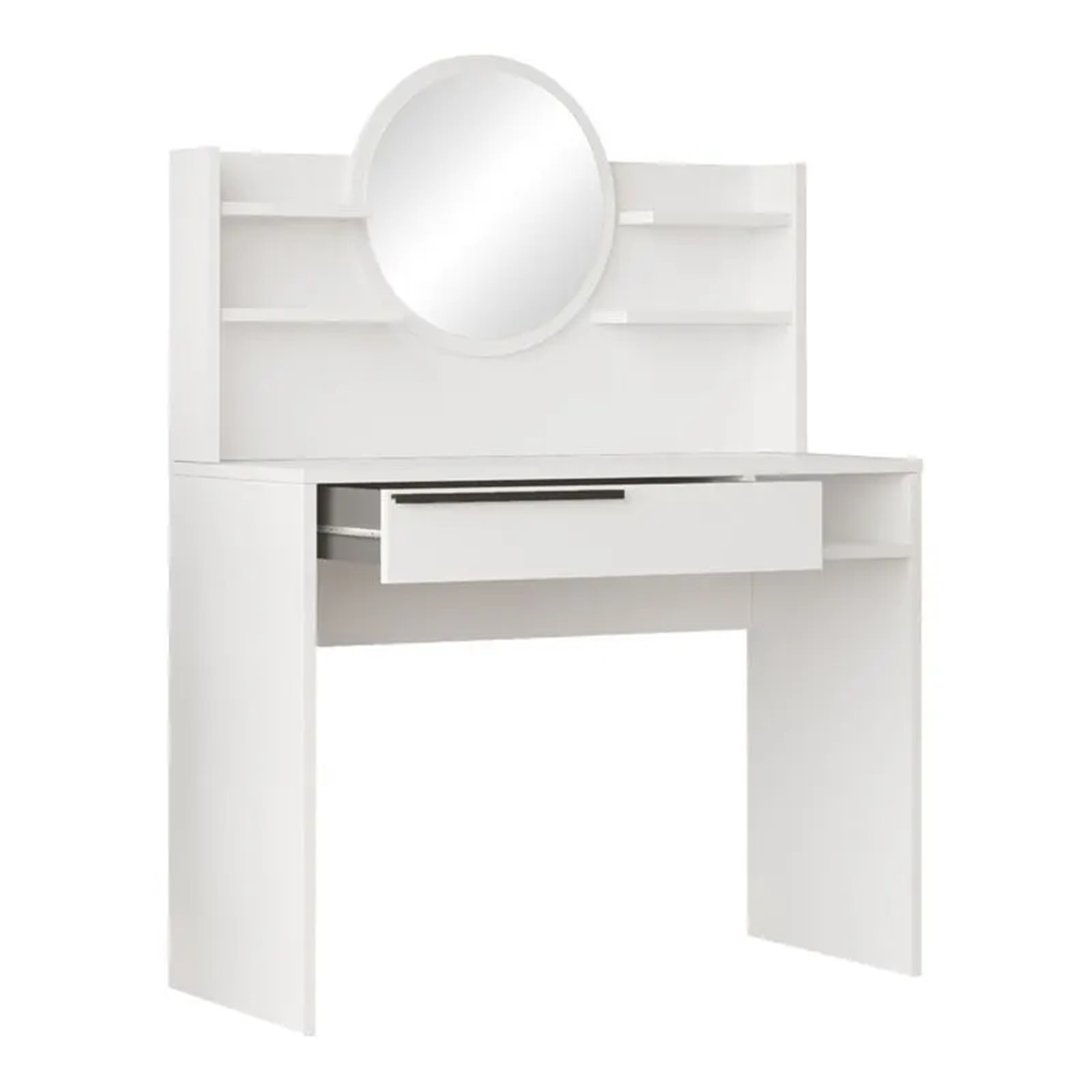 Функционална тоалетка с огледало и рафтове в бяло.
