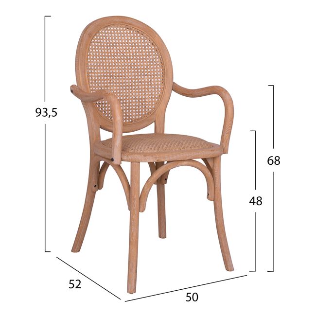 Красив трапезен стол с извити подлакътници, изработен от дървена конструкция от бряст в натурален цвят, с плетена ратанова седалка и облегалка в бежов нюанс.