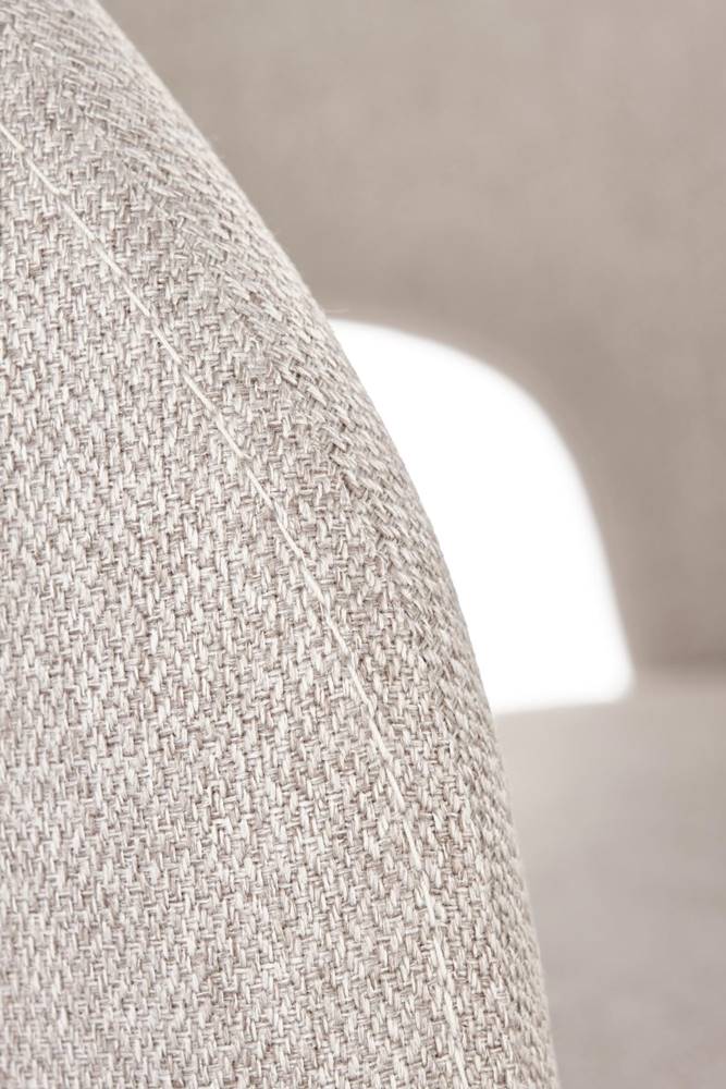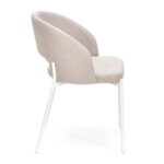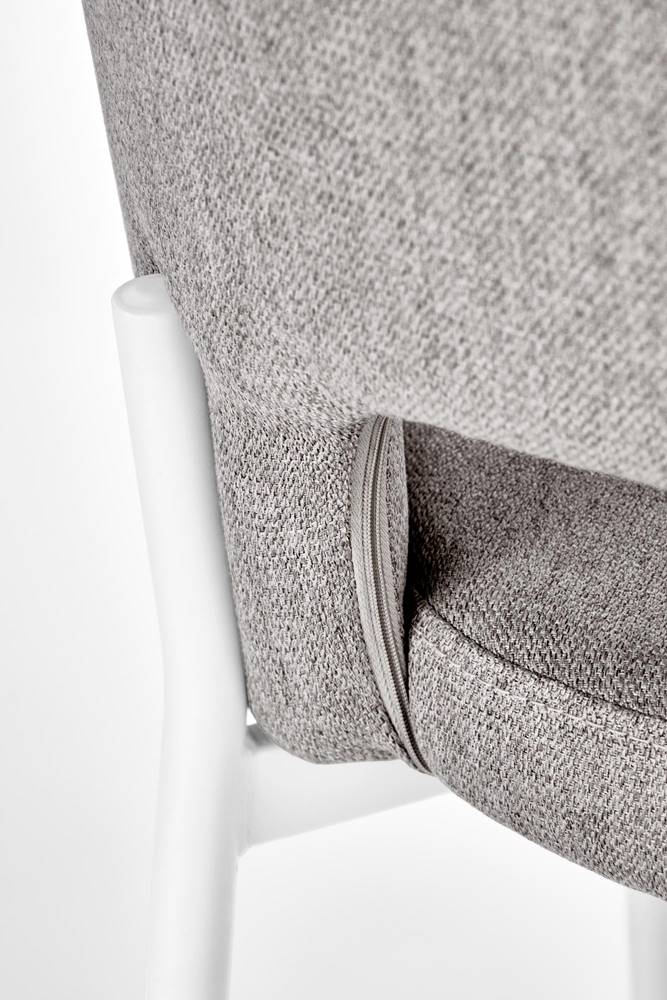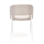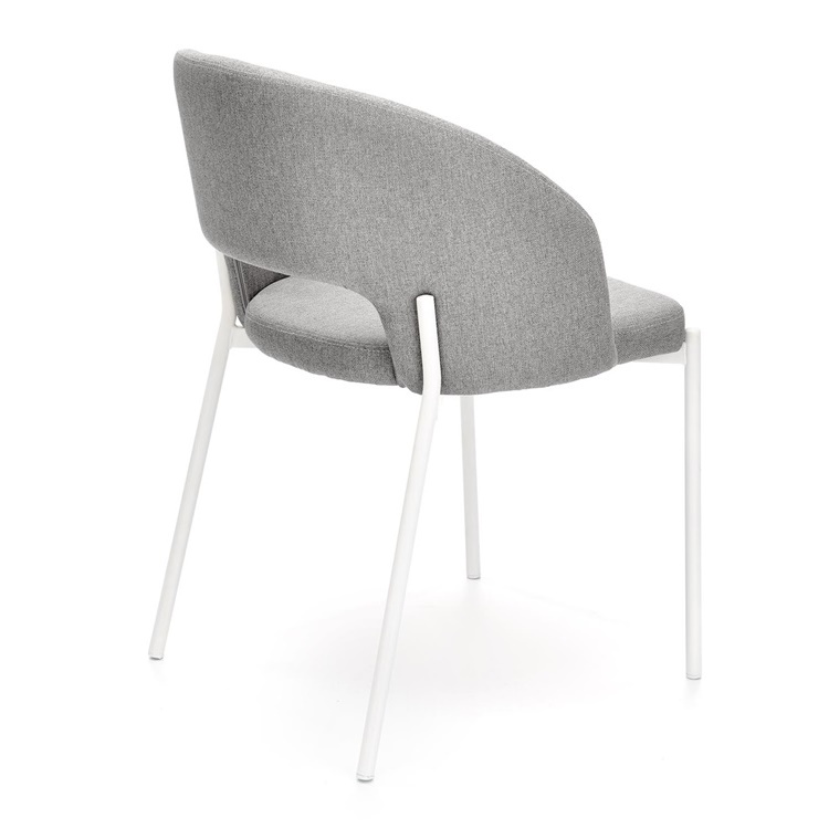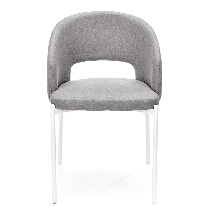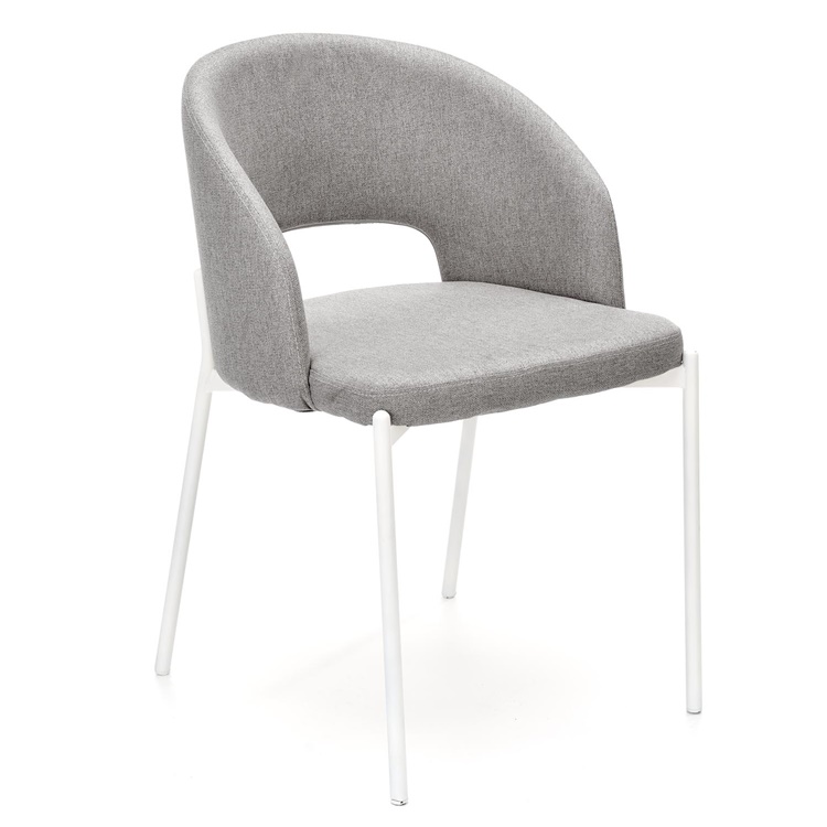 Модерен трапезен стол с атрактивна овална форма и изрязан детайл на гърба, изработен с текстилна дамаска и метални бели крака.