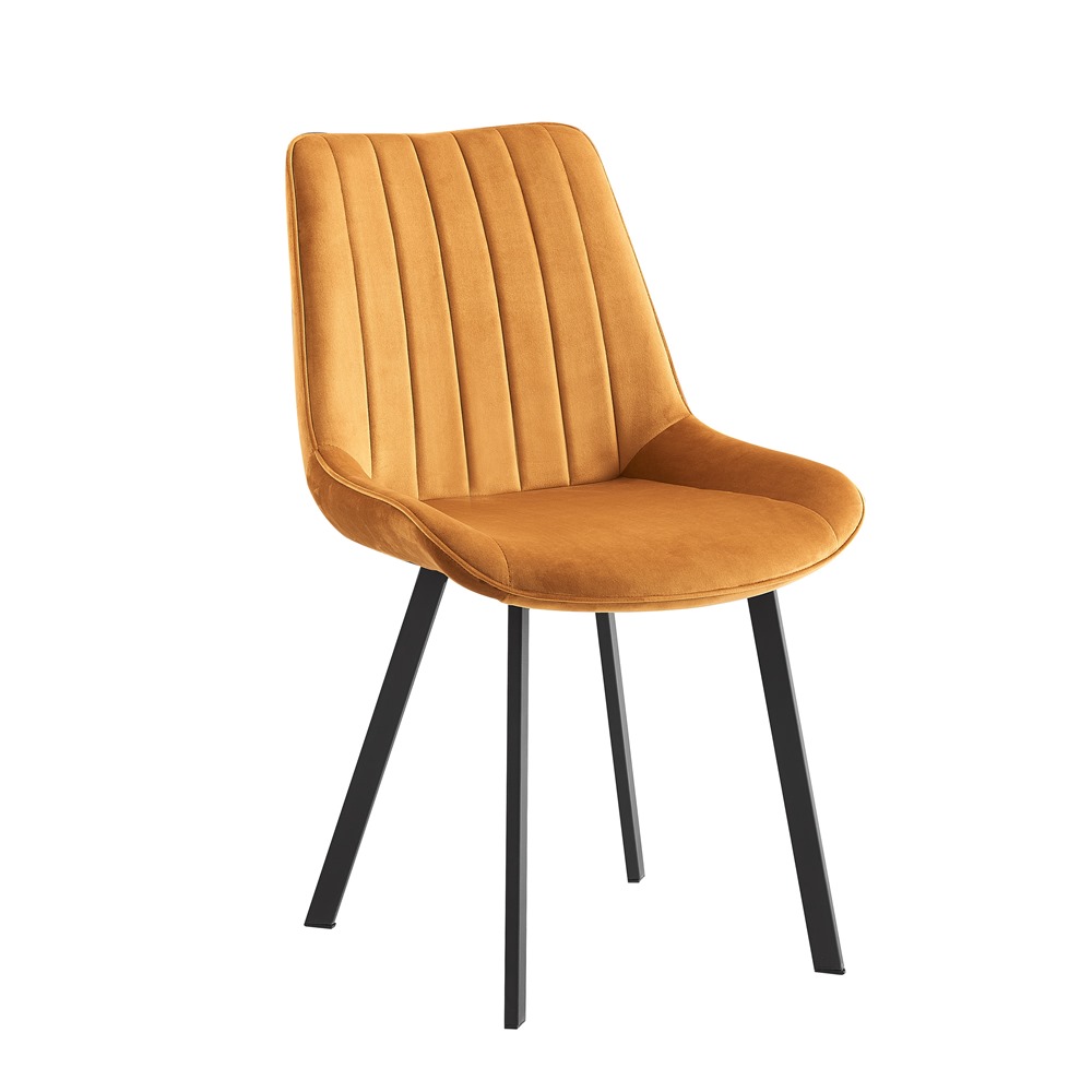 Трапезен стол с дамаска в цвят горчица или кафяво и черни метални крака.