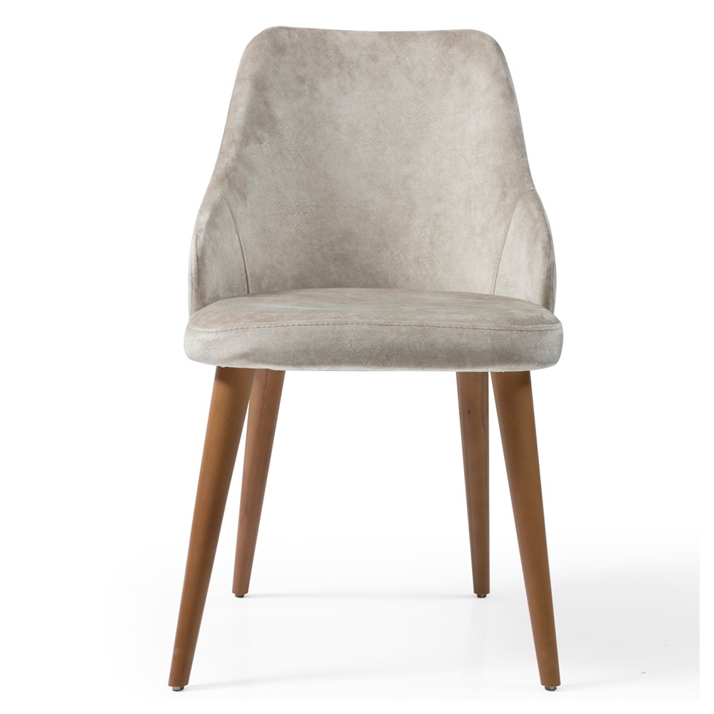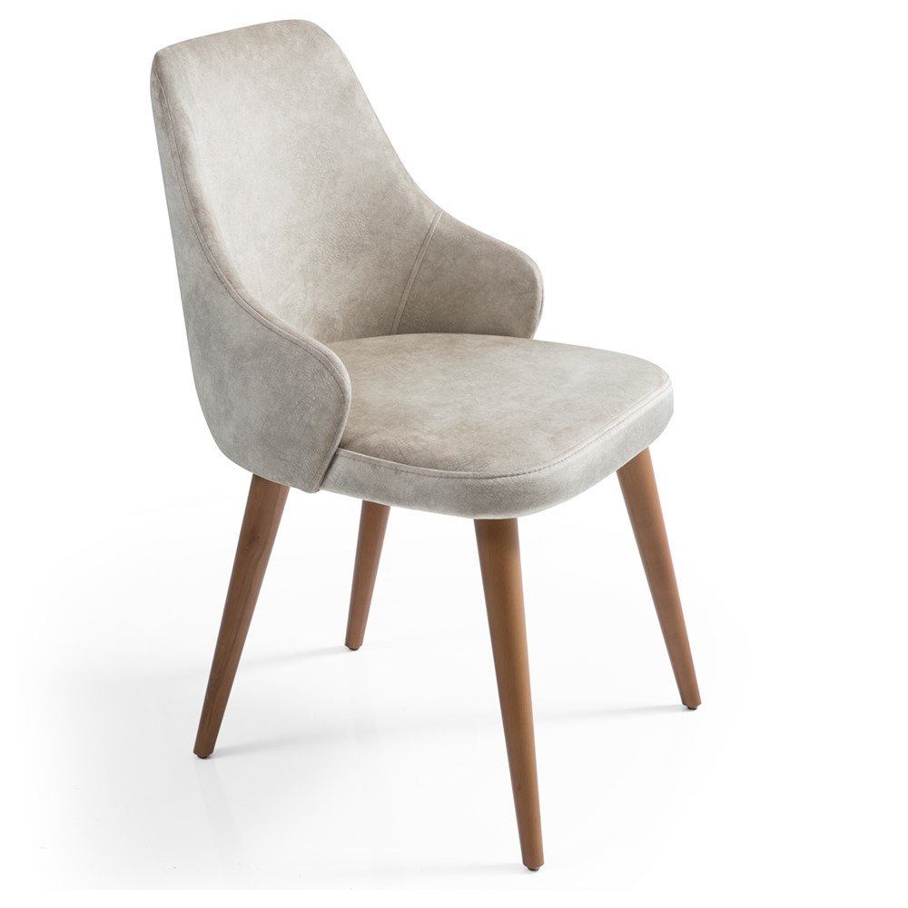 Стилен трапезен стол с подлакътници, изработен с дървени крака и текстилна дамаска в цвят слонова кост, наподобяваща еко кожа.