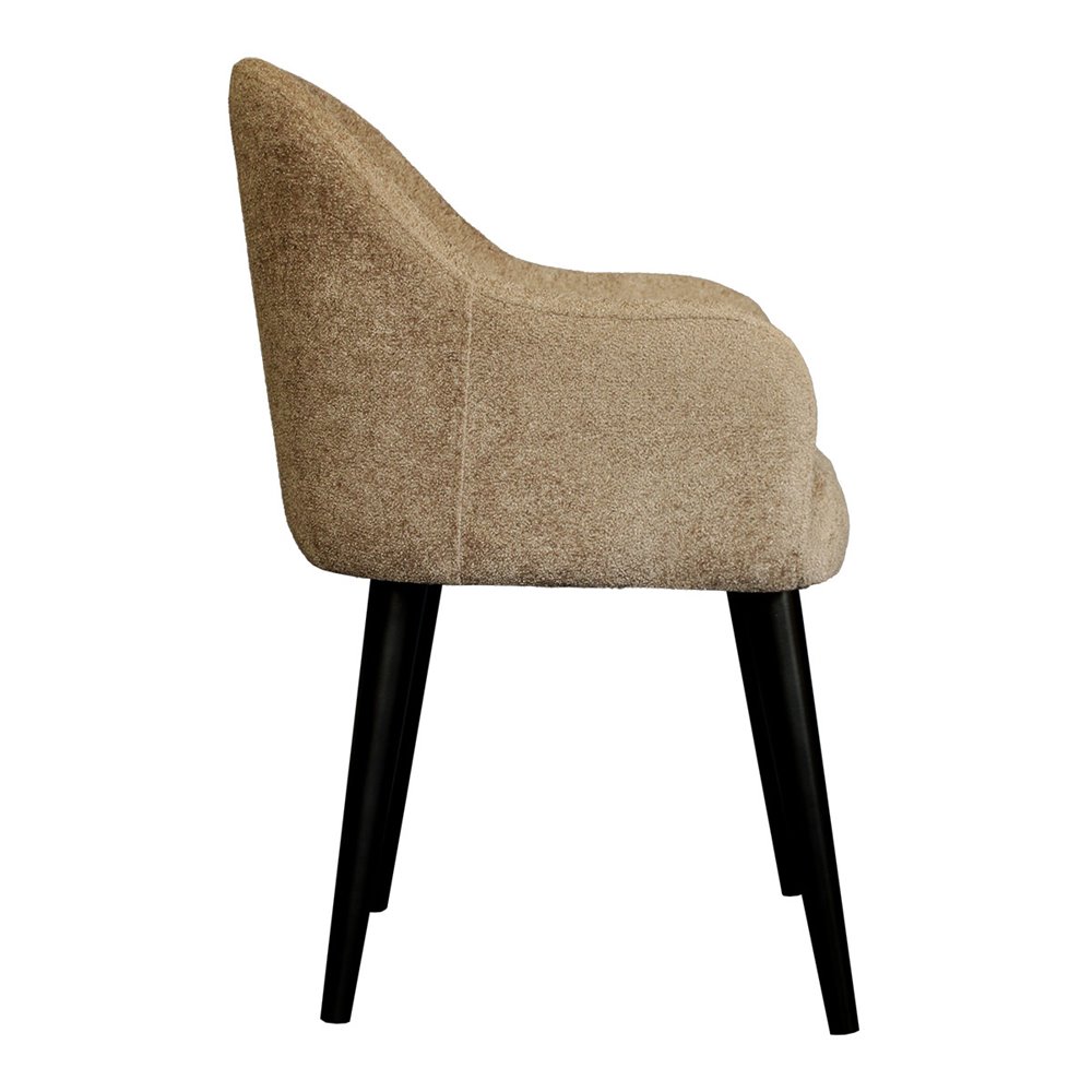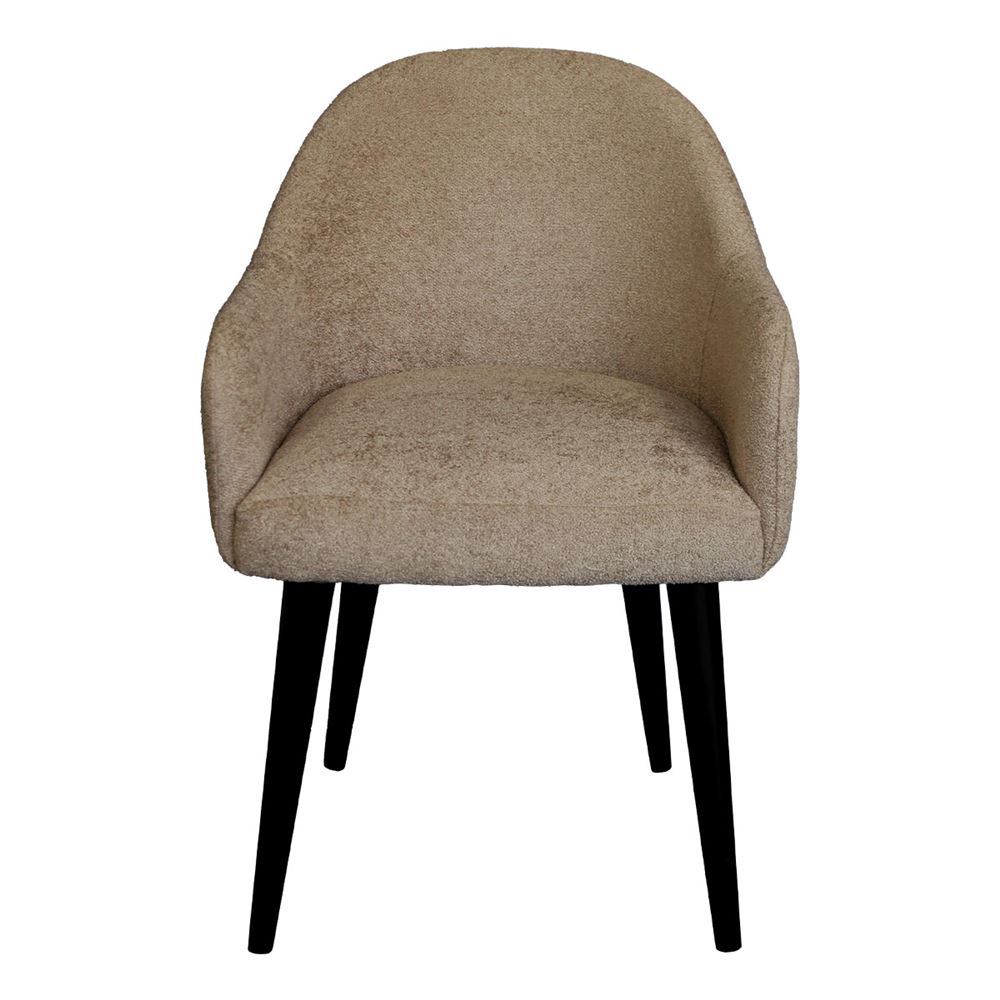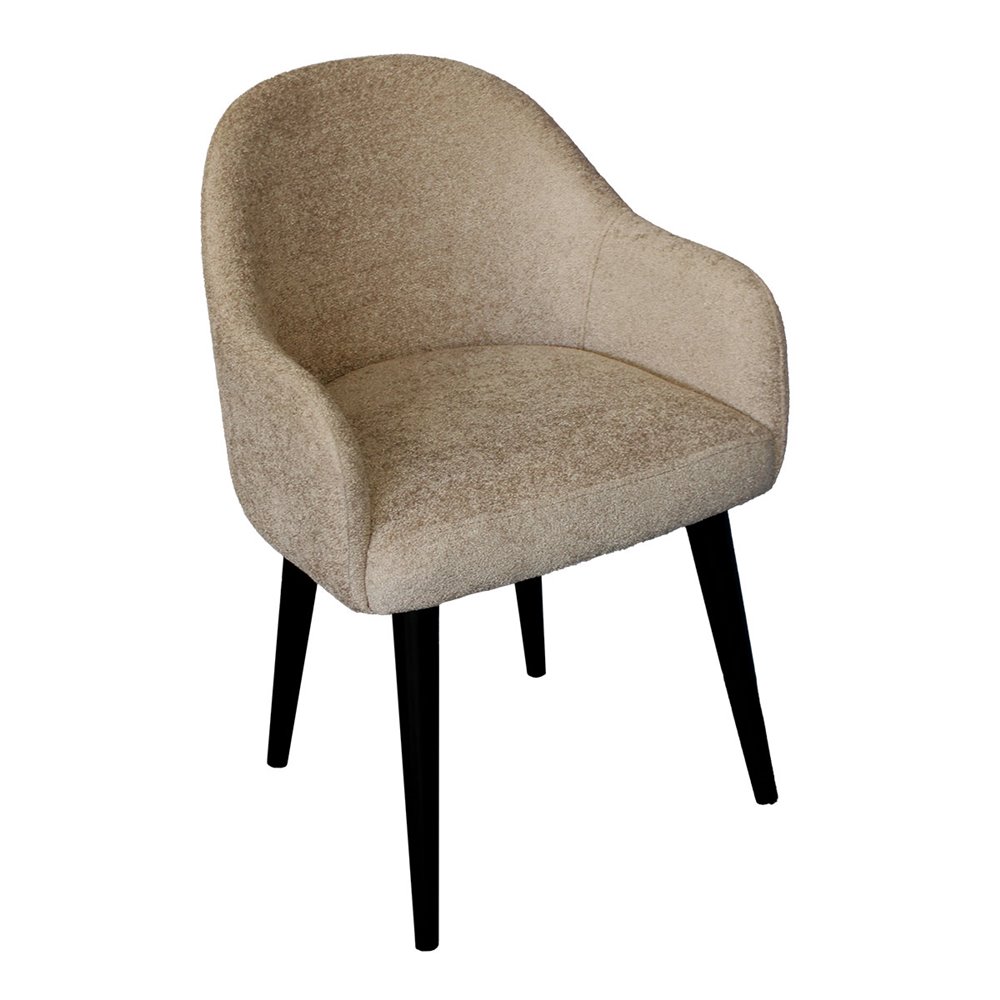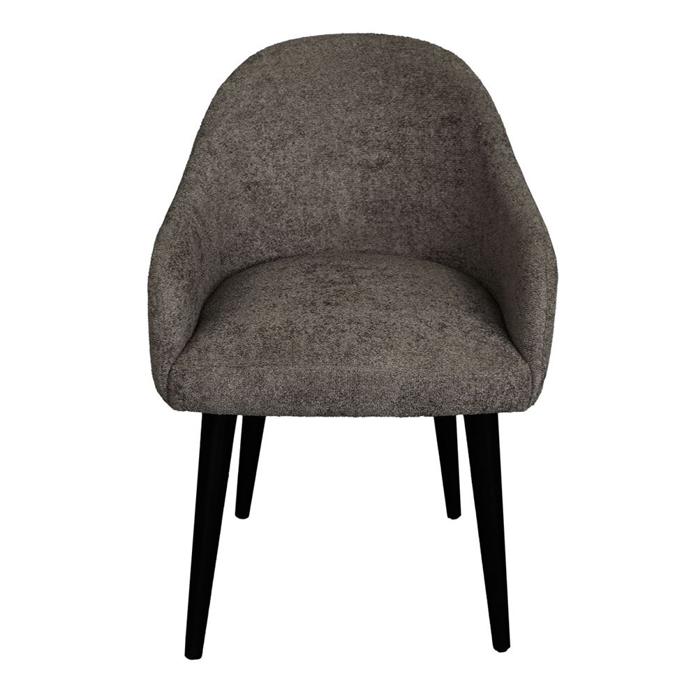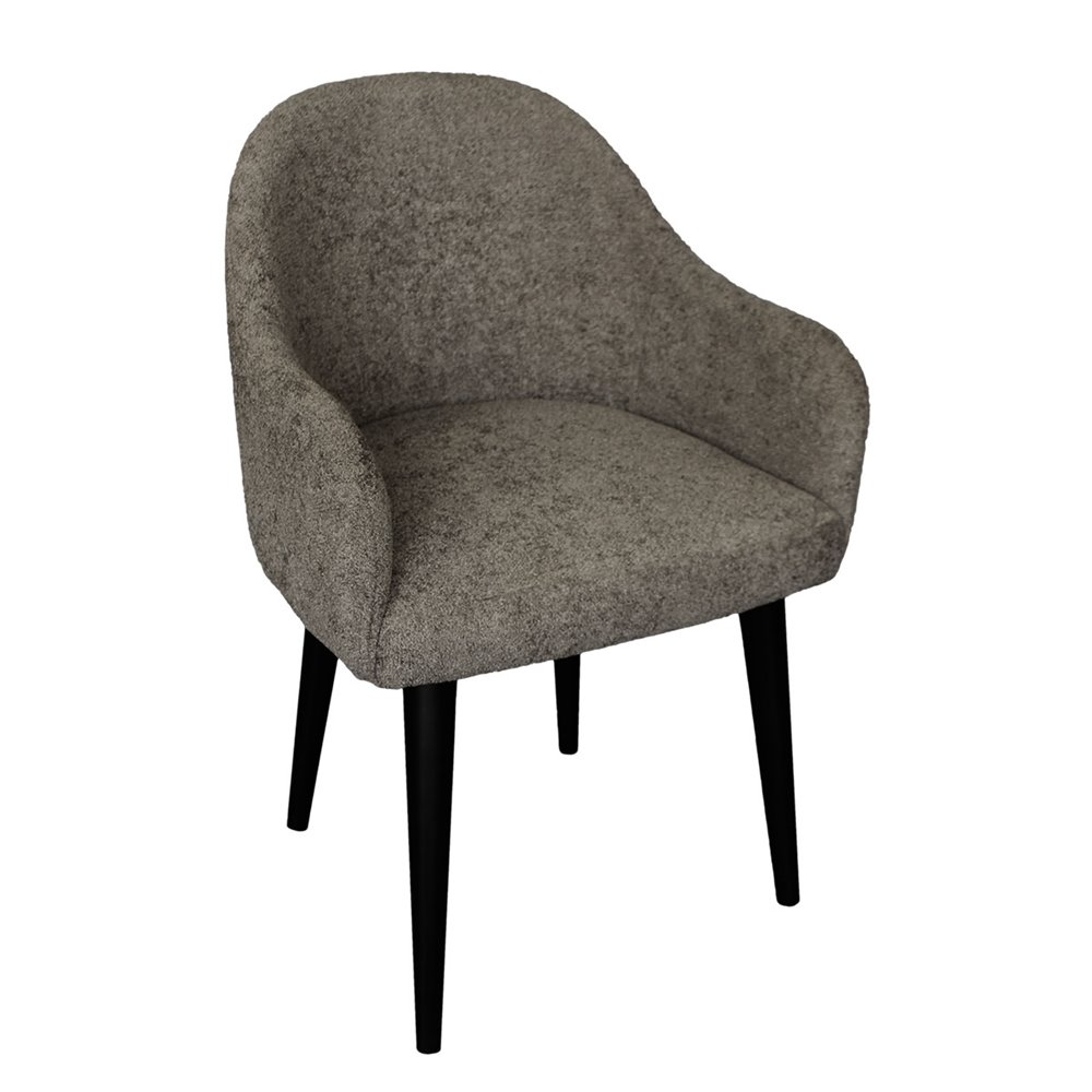 Трапезен стол, изработен с удобни подлакътници, черни дървени крака от масив и текстилна дамаска в сив или бежов цвят.