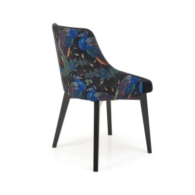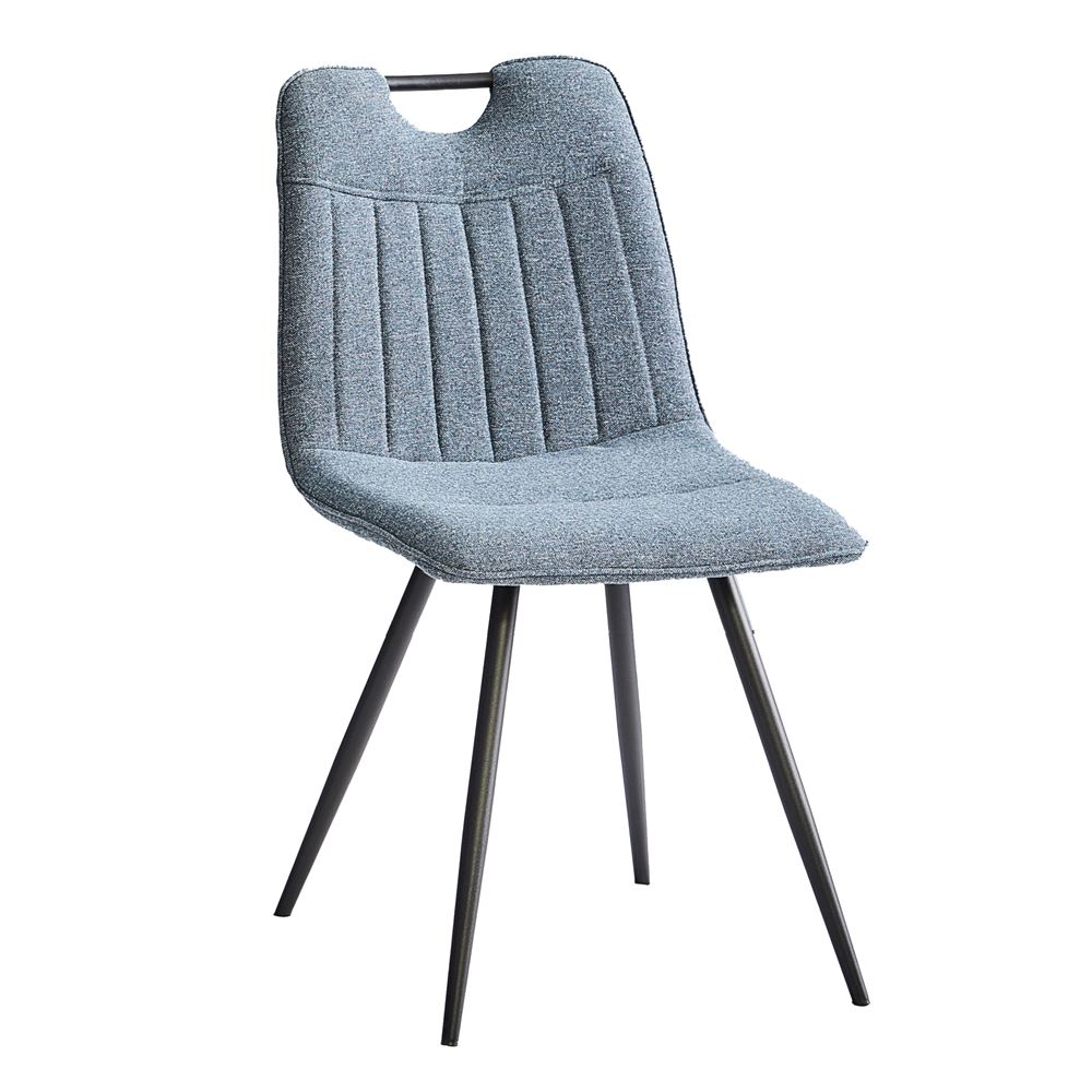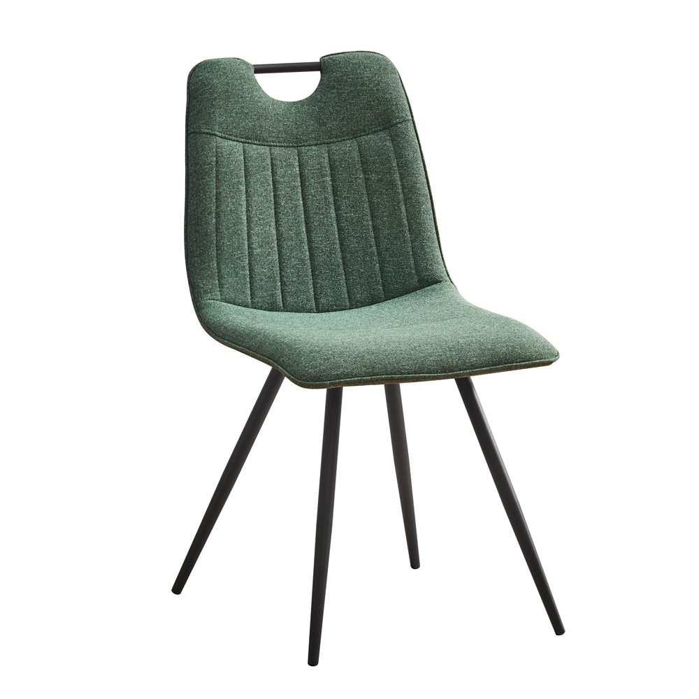 Практичен трапезен стол с дръжка на облегалката, изработен с текстилна дамаска и метални крака.