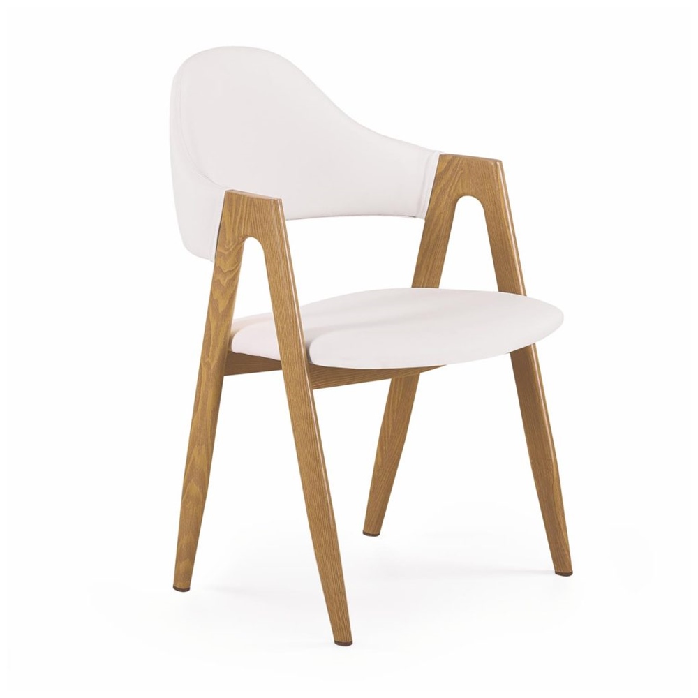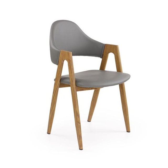 Сив трапезен стол от еко кожа, с метални крака, имитиращи дърво.