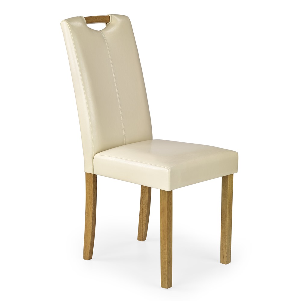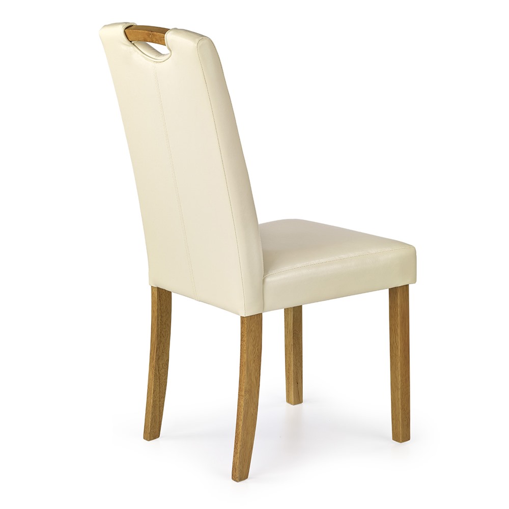 Трапезен стол от масивно дърво и еко кожа в цветова комбинация бук и крем.