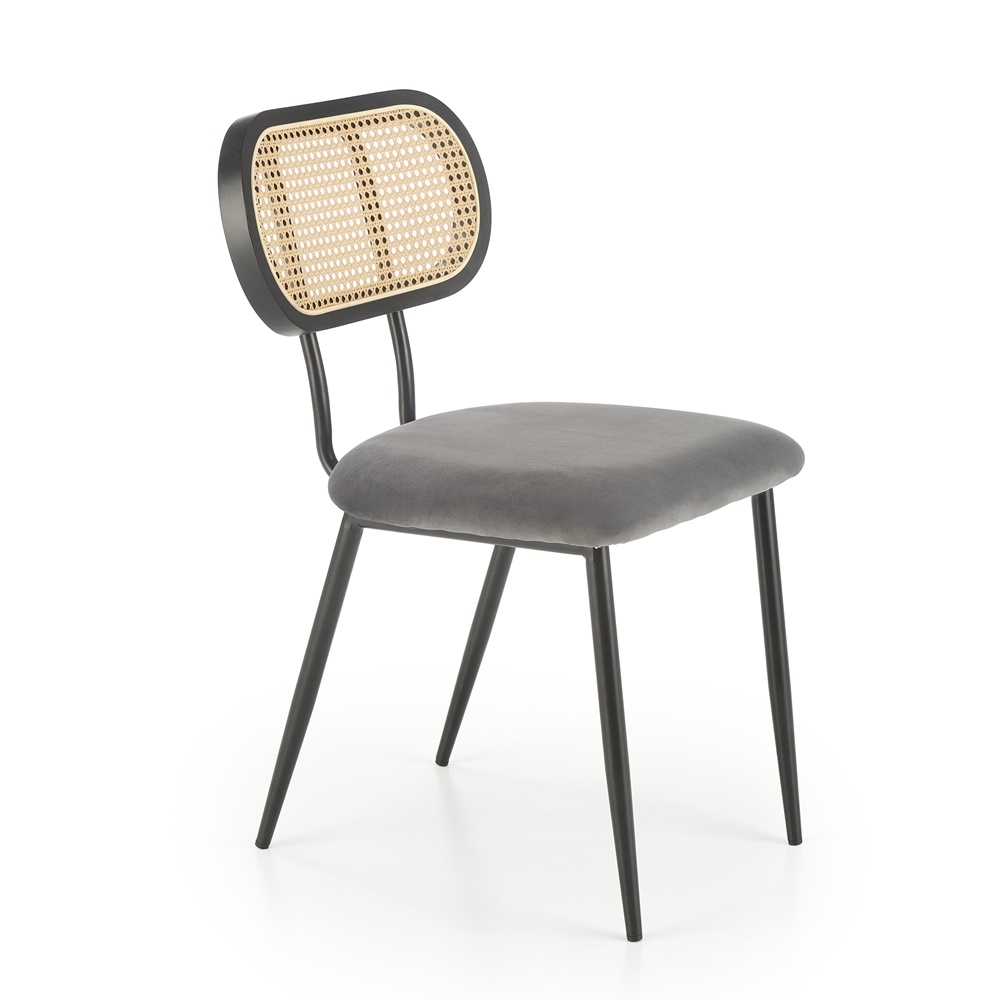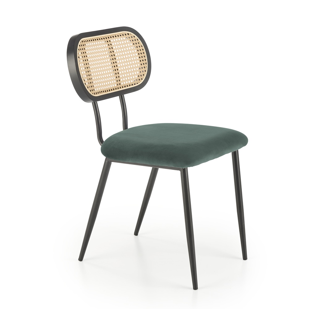Стилен трапезен стол с конструкция от метал, овална облегалка от синтетичен ратан и седалка от кадифе.
