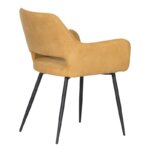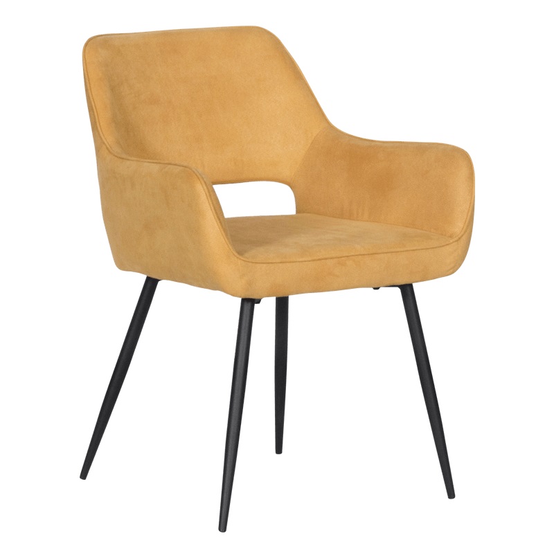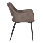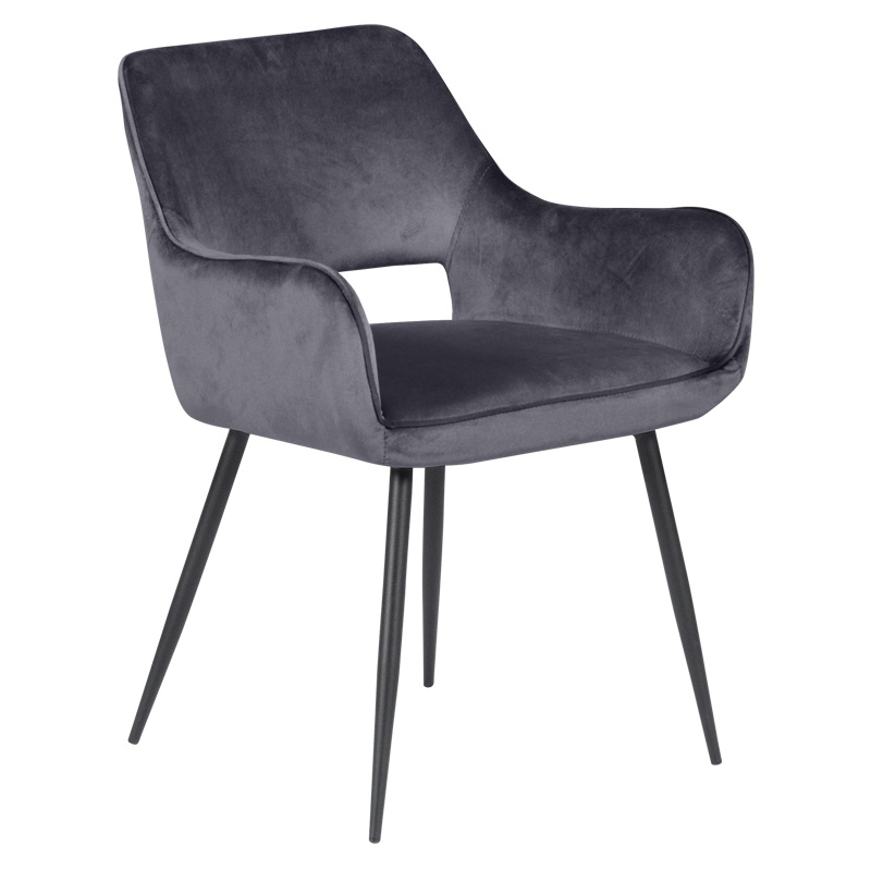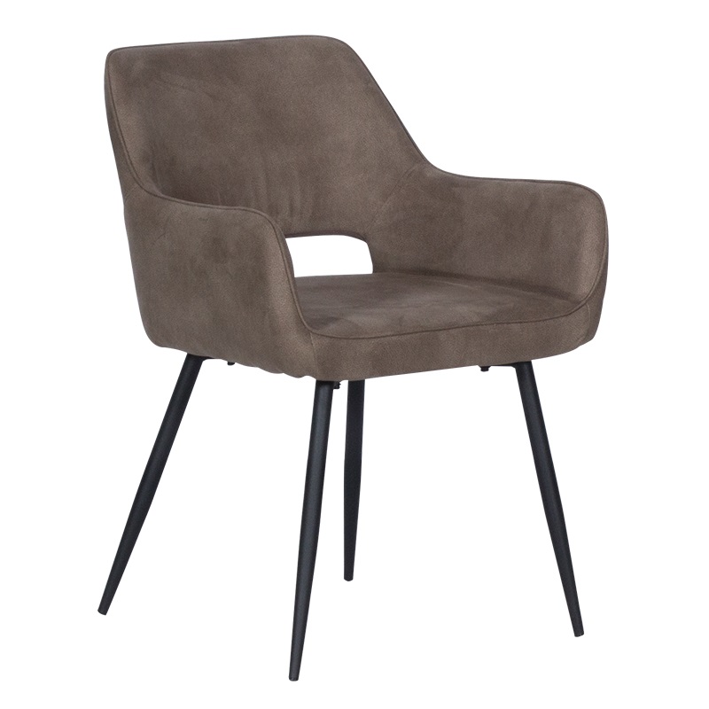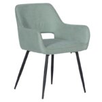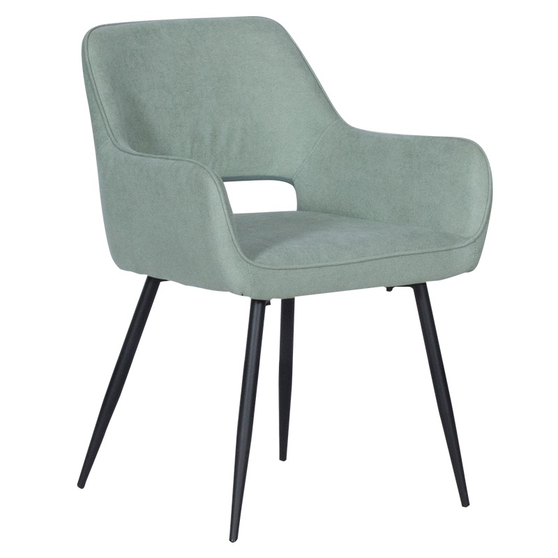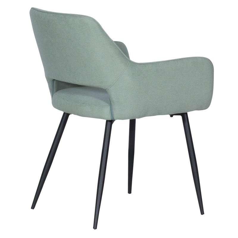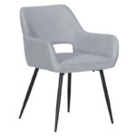 Трапезен стол с подлакътници и изрязан детайл на облегалката, изработен с метална основа в черно и мека текстилна дамаска.
