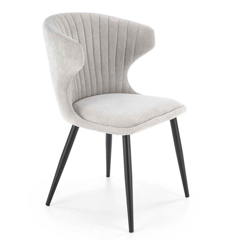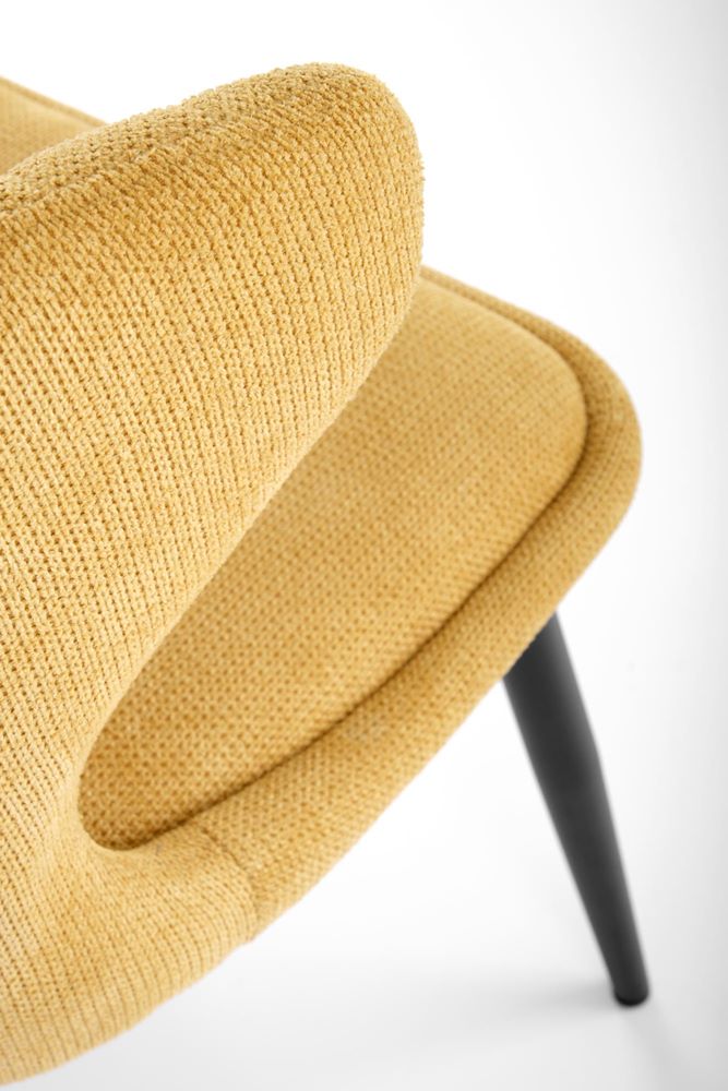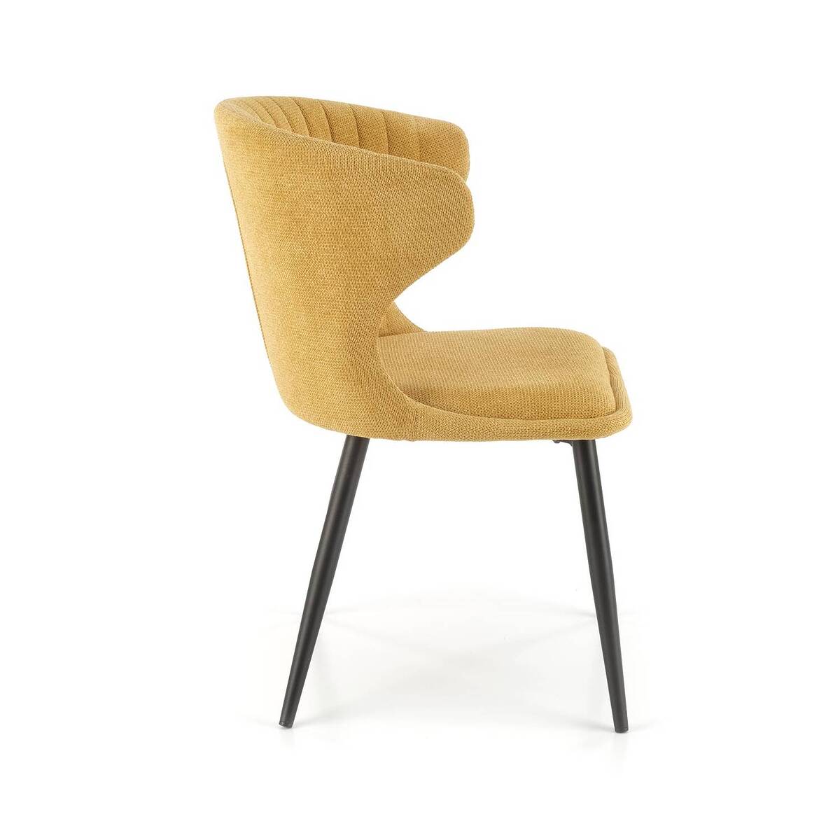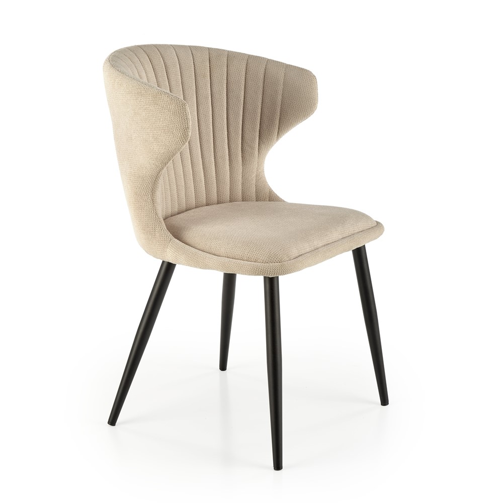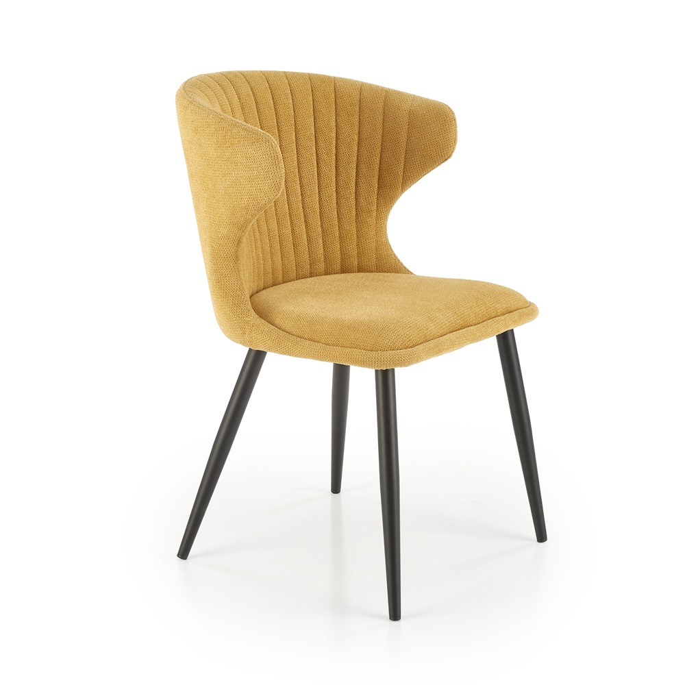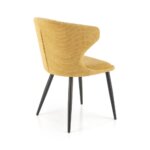 Красив трапезен стол с нестандартна облегалка и черни метални крака.