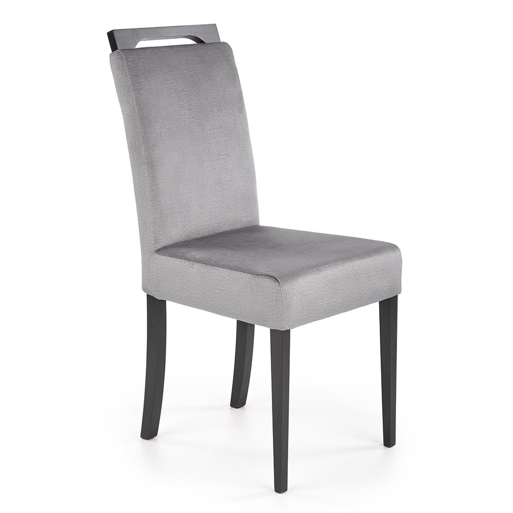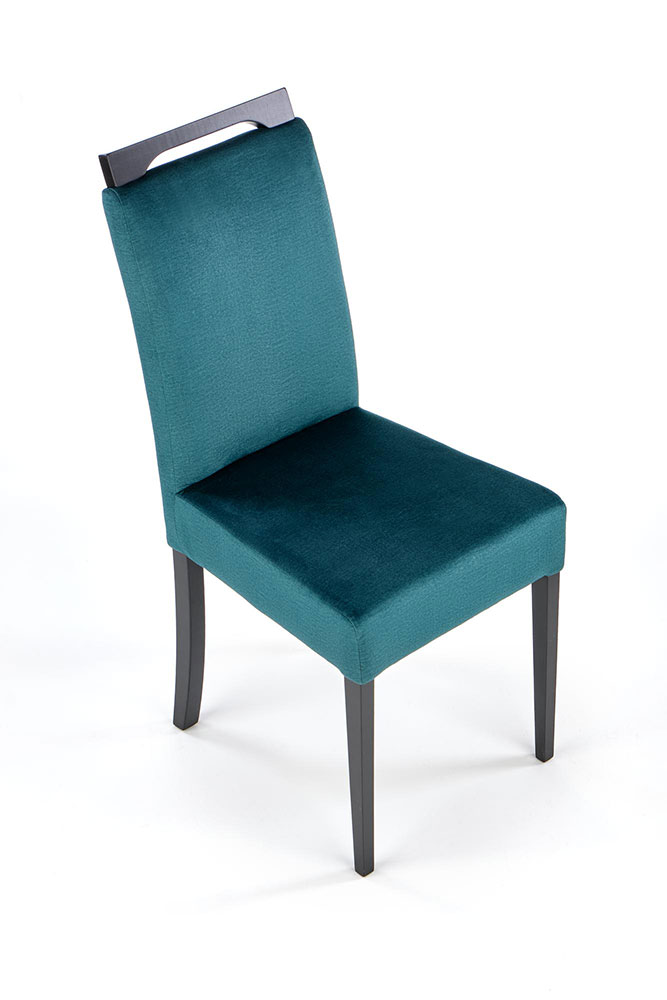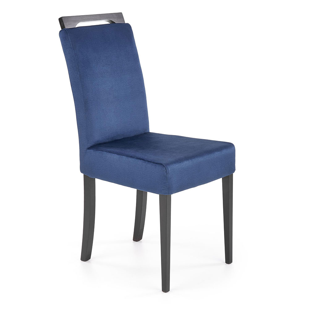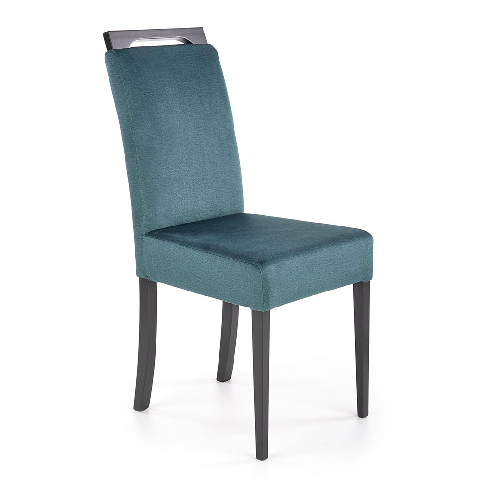 Модерен трапезен стол с тапицерия от кадифе, облегалка и крака, изработени от масивно дърво в черен цвят.