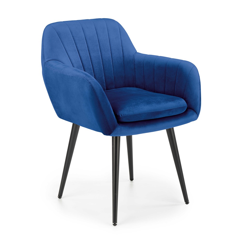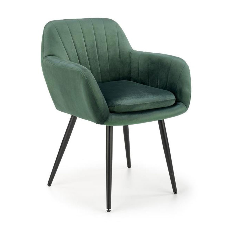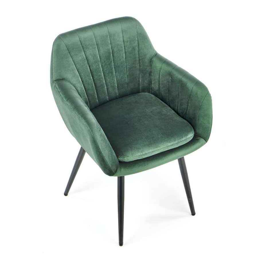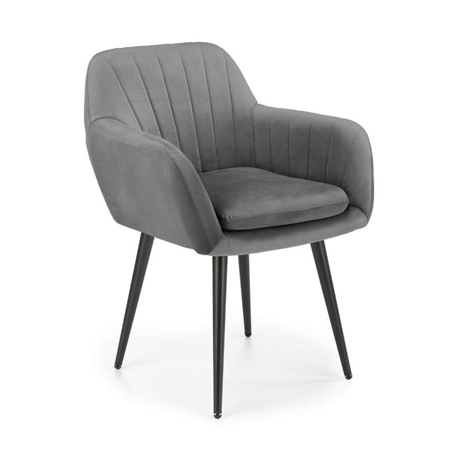 Трапезен стол с дамаска от кадифе и подлакътници наподобяващ кресло с черни метални крака.