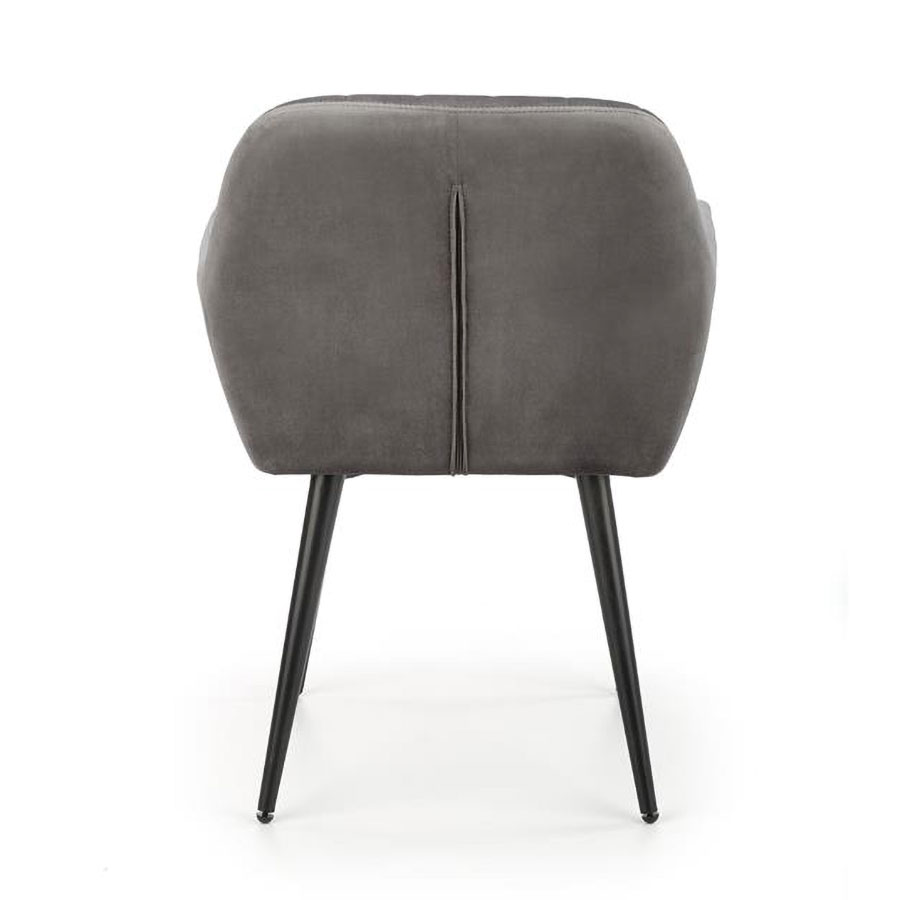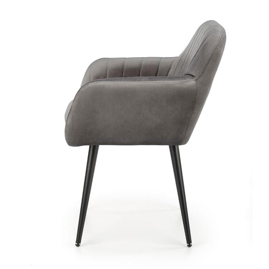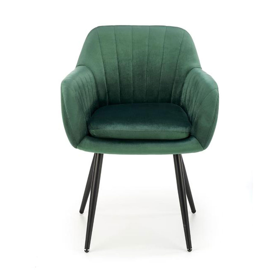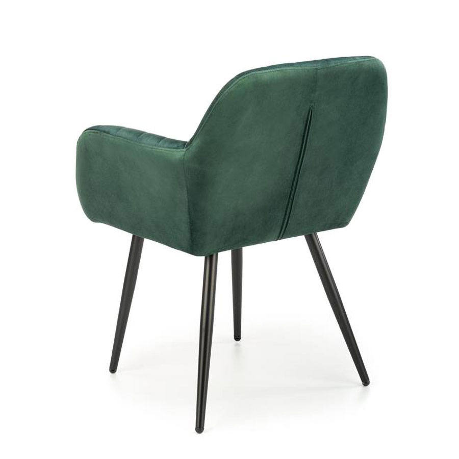 Трапезен стол с дамаска от кадифе и подлакътници наподобяващ кресло с черни метални крака.