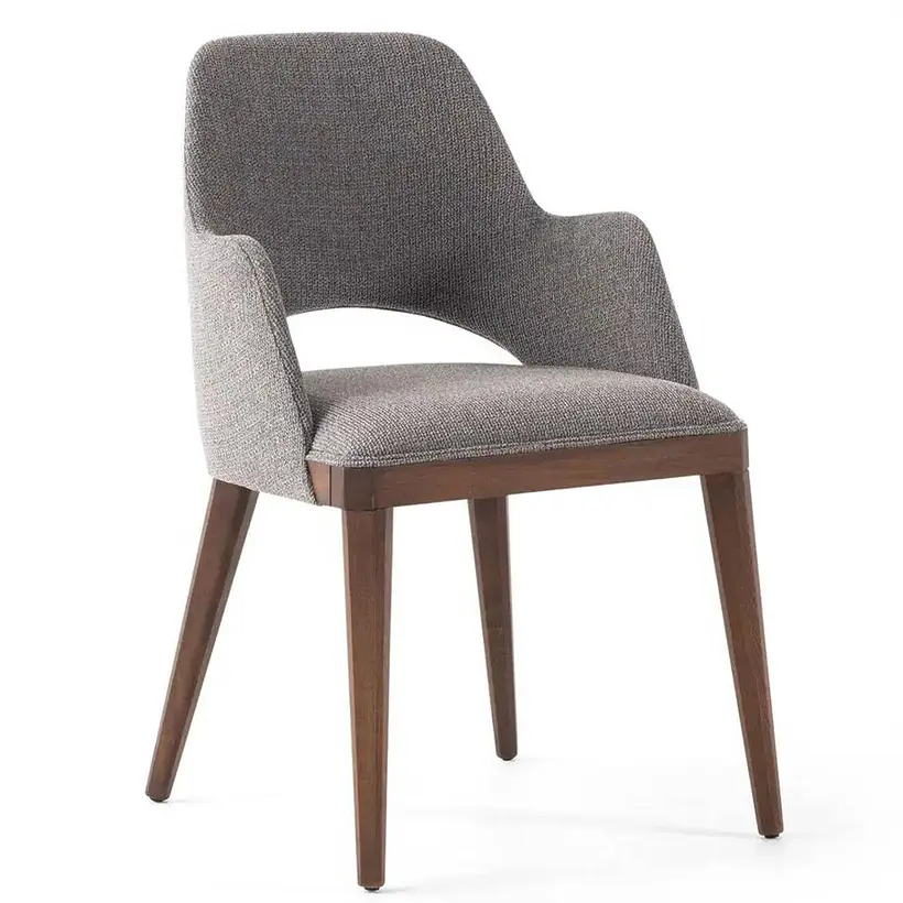 Добавете стил и елегантност към трапезарията си с този трапезен стол от масивно буково дърво в топъл орехов нюанс и мека сива дамаска.