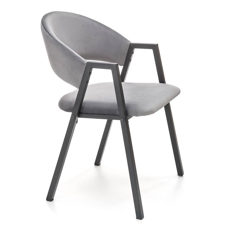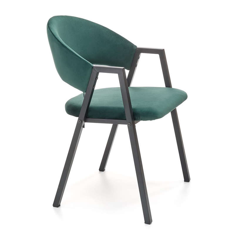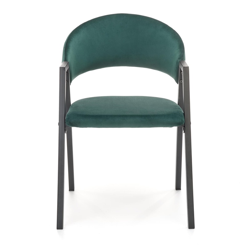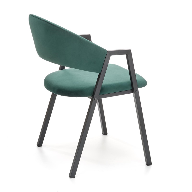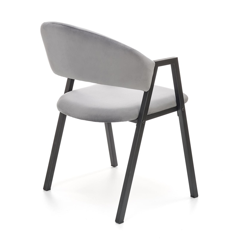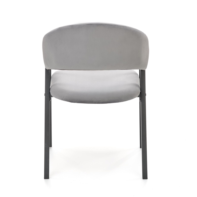 Стилен трапезен стол с овална облегалка и изрязан гръб, изработен с мека кадифена дамаска и черна метална основа.