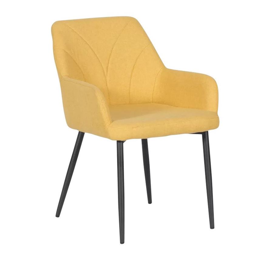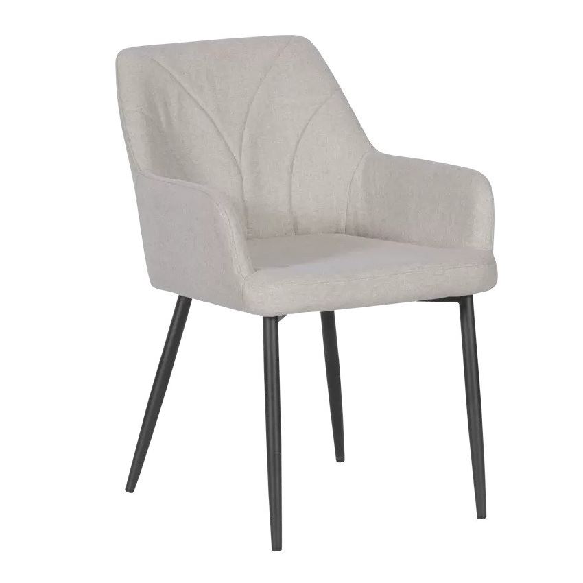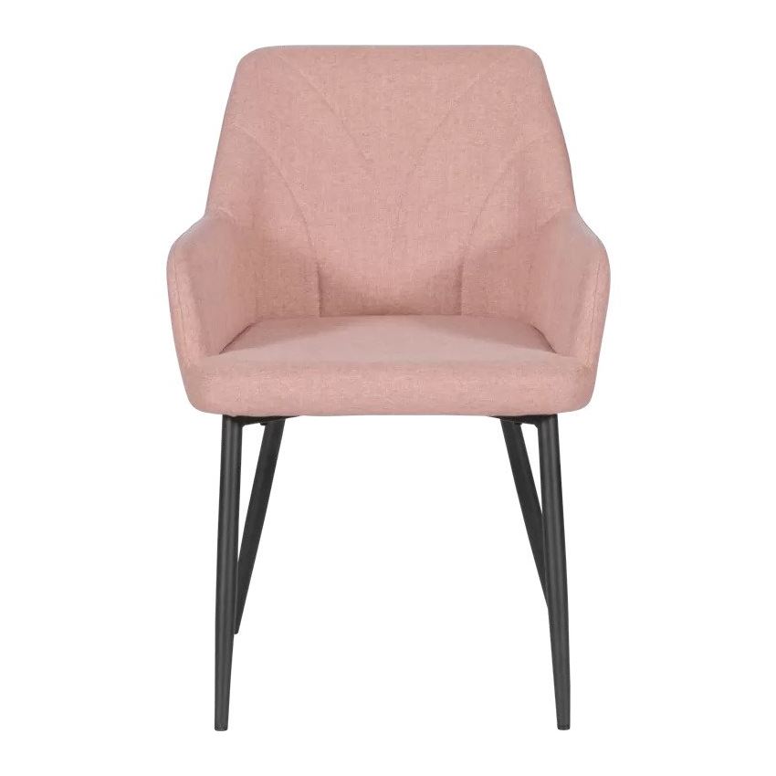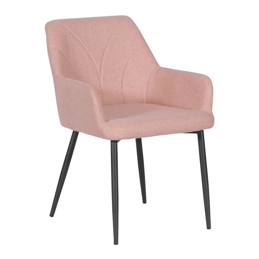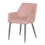 Стилен трапезен стол с комфортна облегалка и подлакътници, изработен с текстилна дамаска и праховобоядисани черни метални крака.