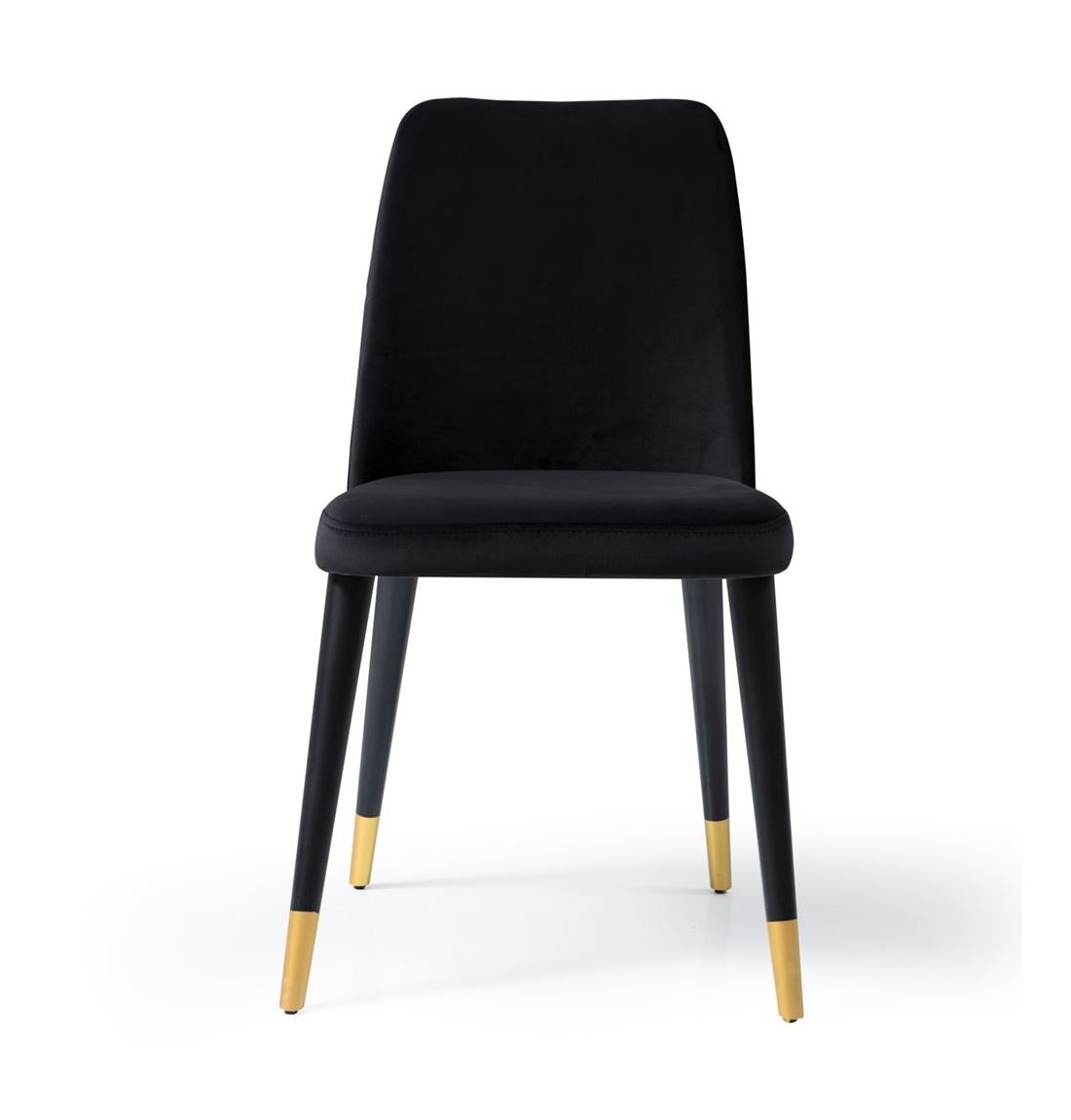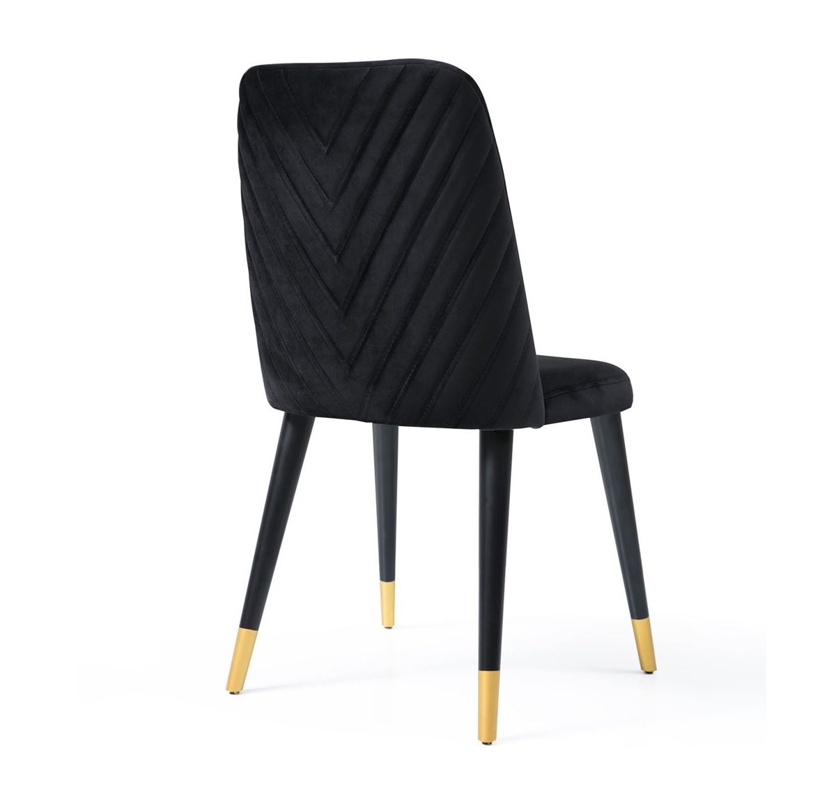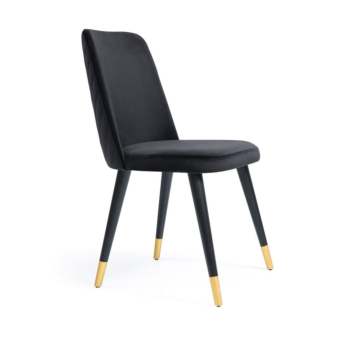 Елегантен черен трапезен стол, изработен с мека текстилна дамаска и дървени крачета със златисти детайли.
