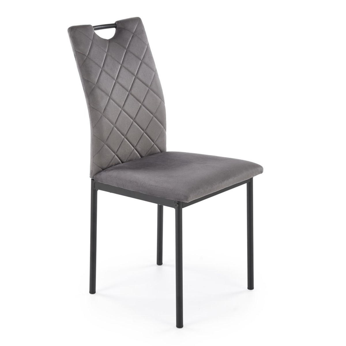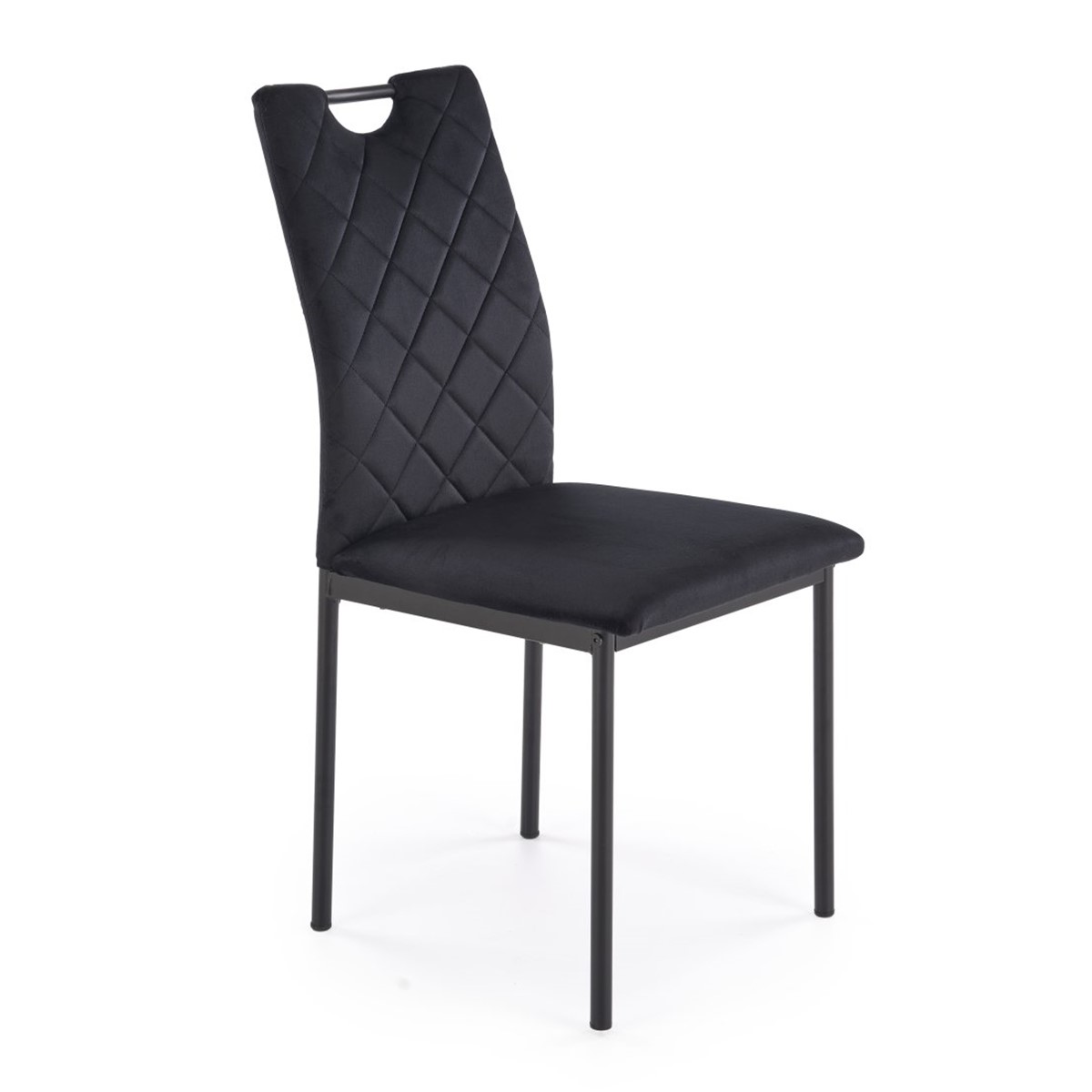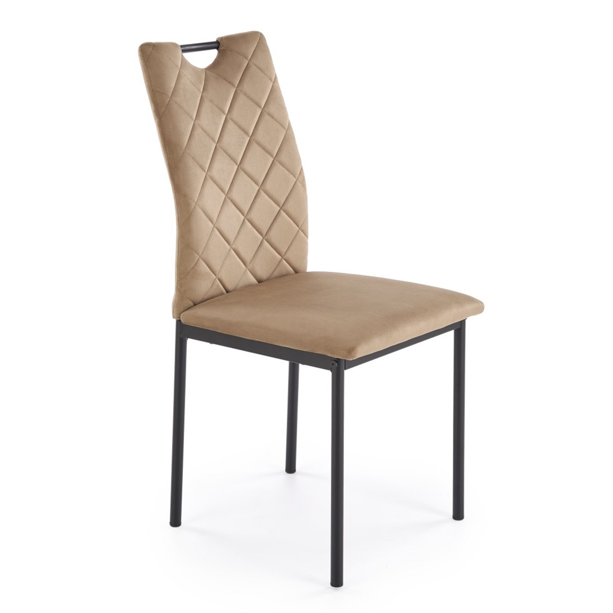 Елегантен трапезен стол с мека текстилна дамаска тип кадифе и стабилни черни метални крака.