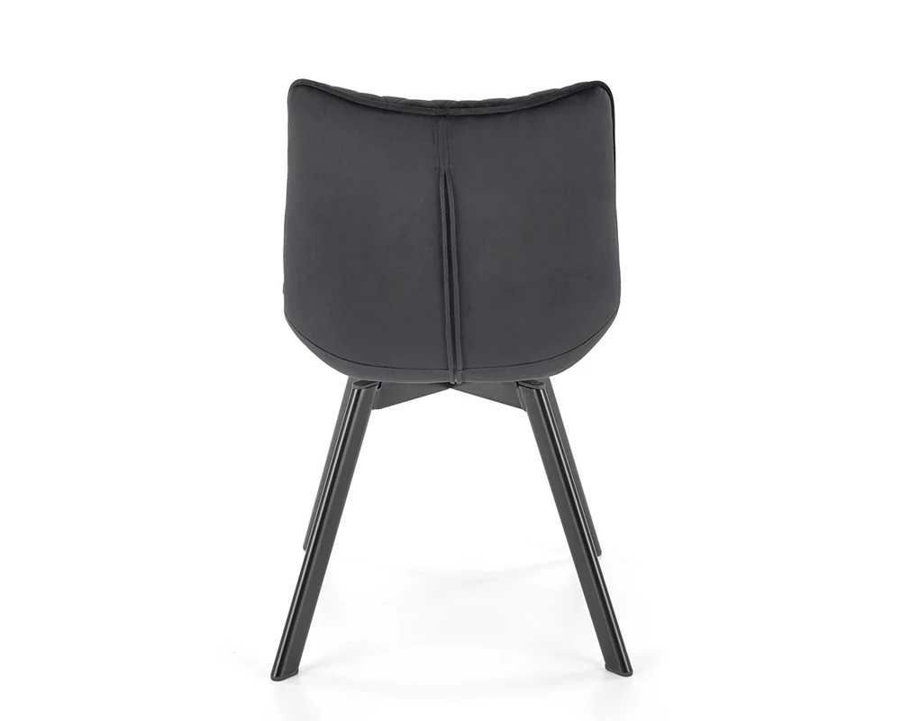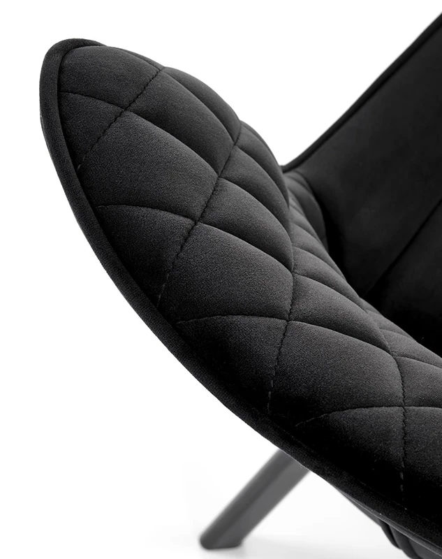 Формата комбинира плавно извита седалка и облегалка с декоративно капитониране.