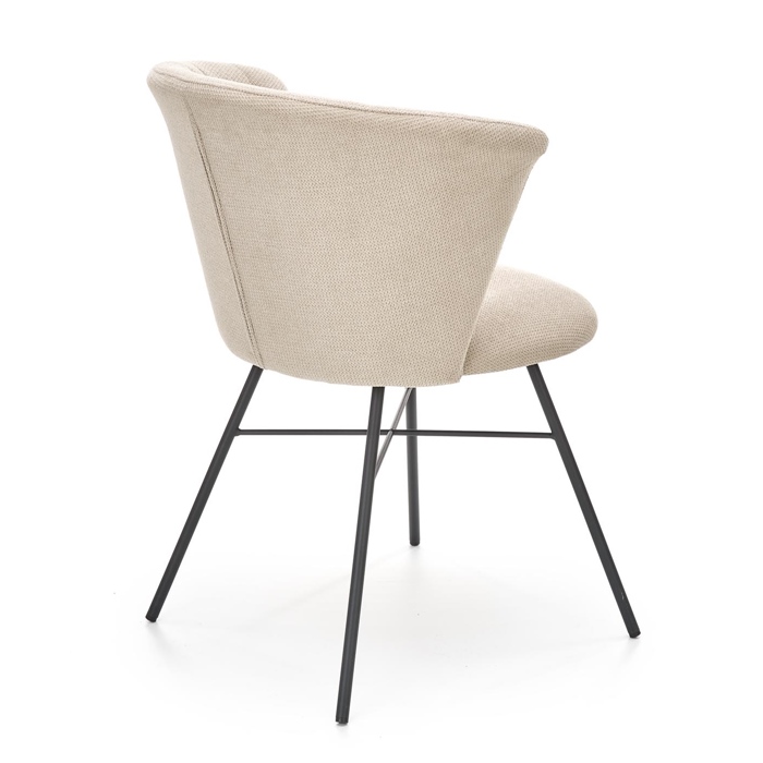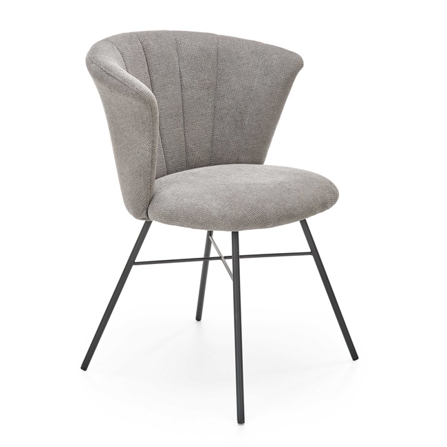 Модерен трапезен стол, изработен с черна метална основа, нестандартна облегалка и седалка с текстилна дамаска.