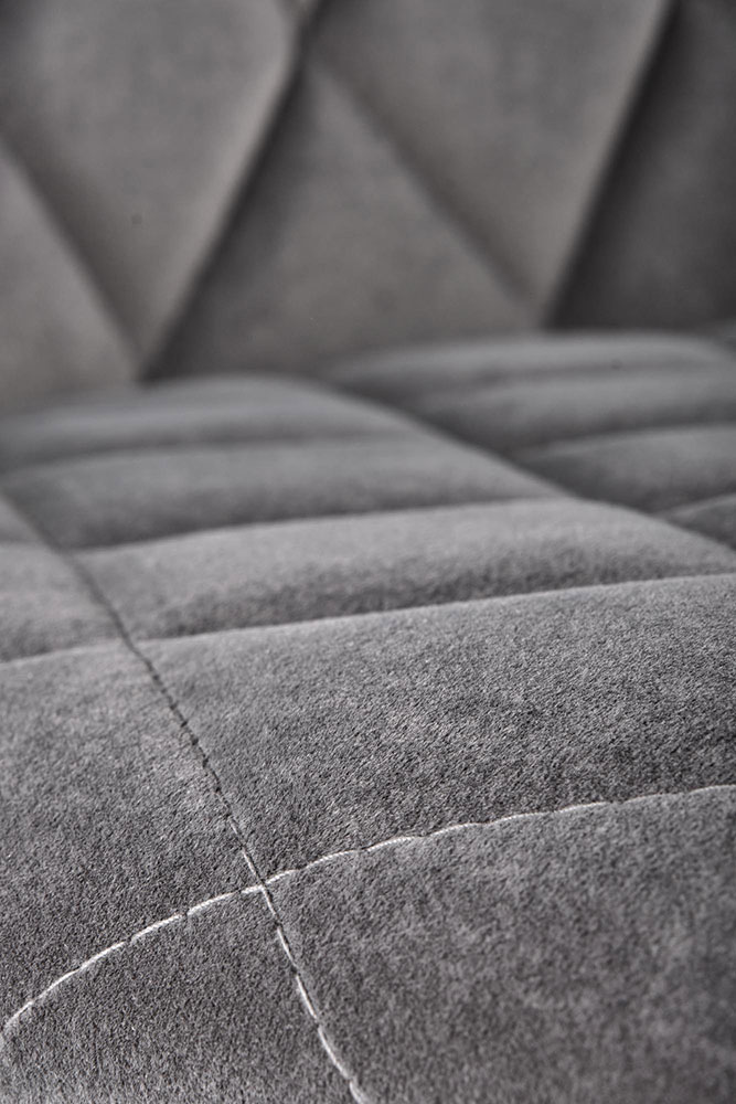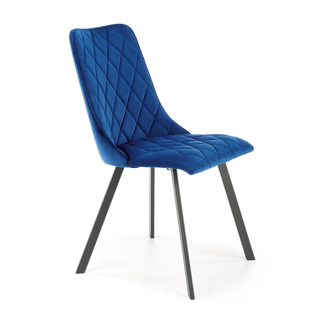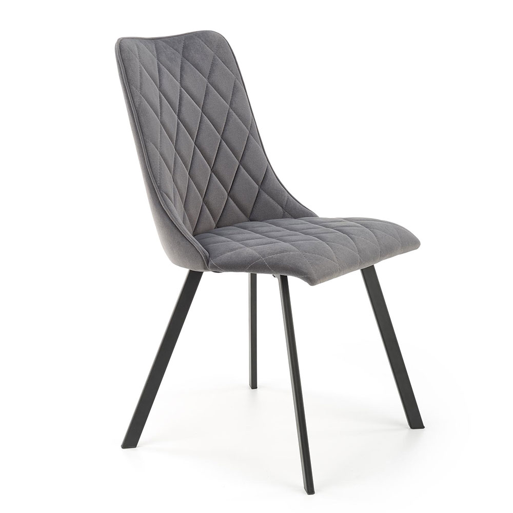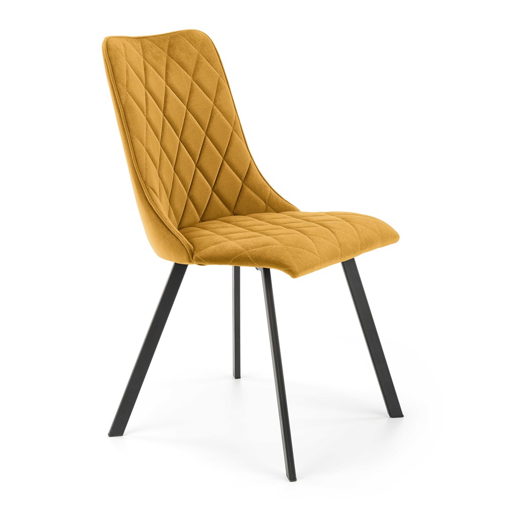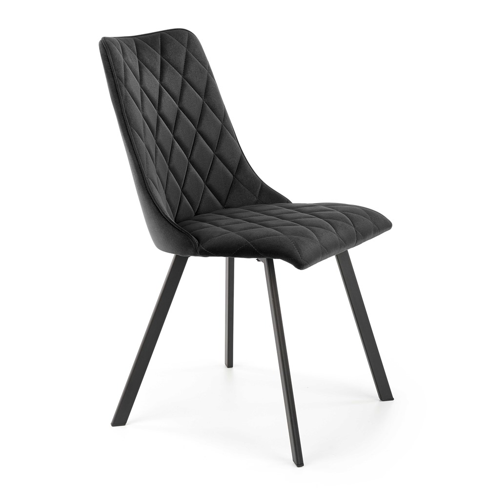 Модерен трапезен стол с тапицерия от кадифе на ромбоиди и метални крака в черен цвят.