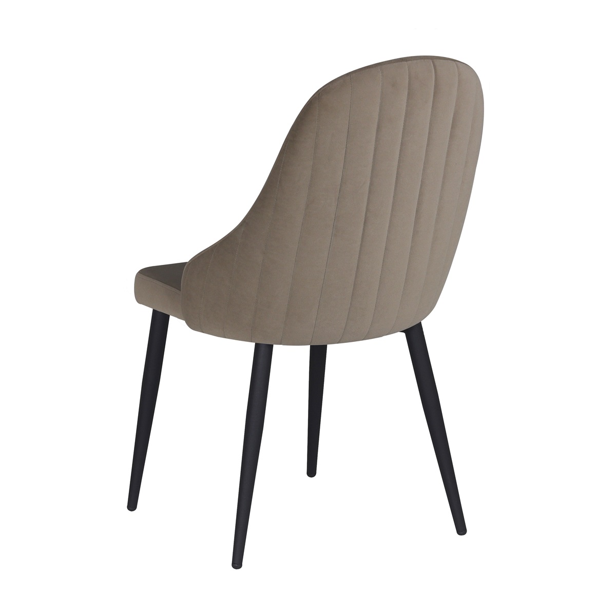 Трапезен стол с текстилна дамаска в кафяв цвят, комбиниран със стабилни черни метални крака.