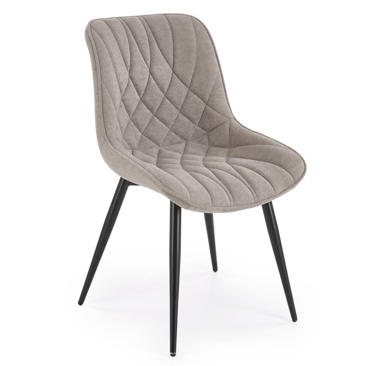 Удобен трапезен стол, изработен с текстилна дамаска на геометрични фигури в сиво или бежово и метални крака в черен цвят.
