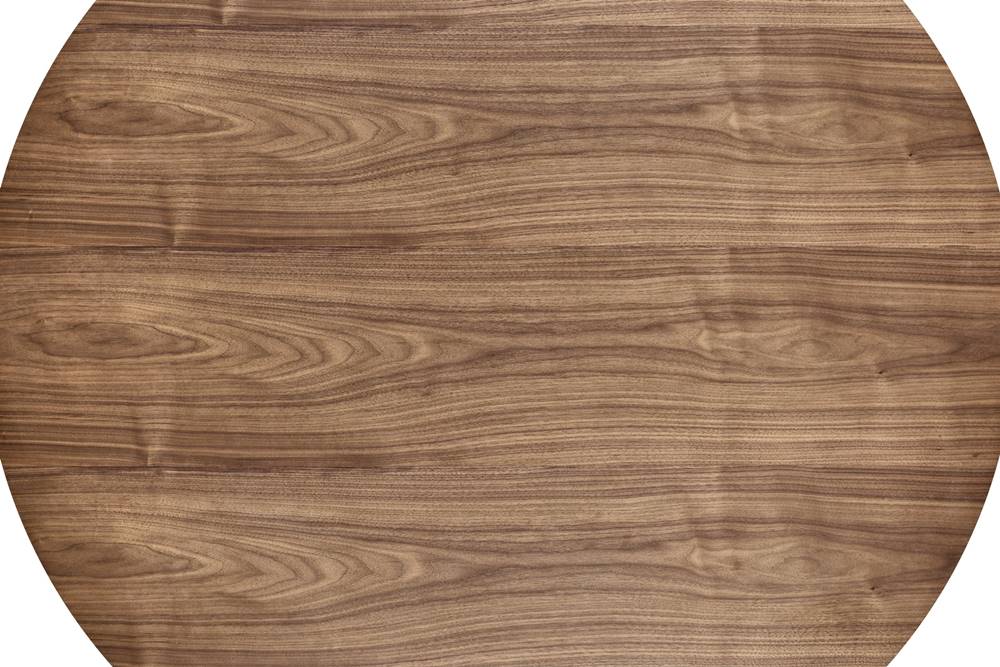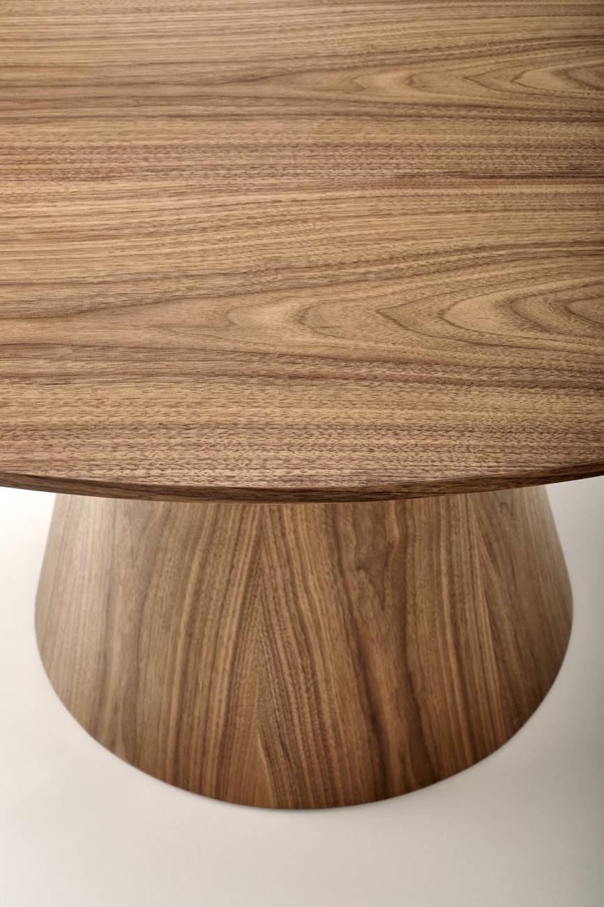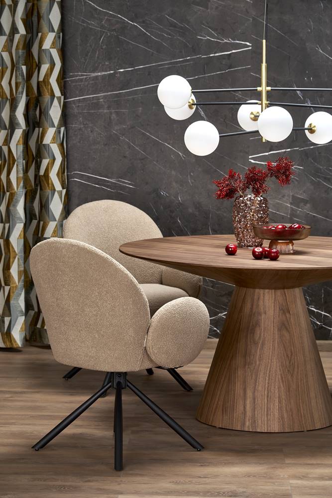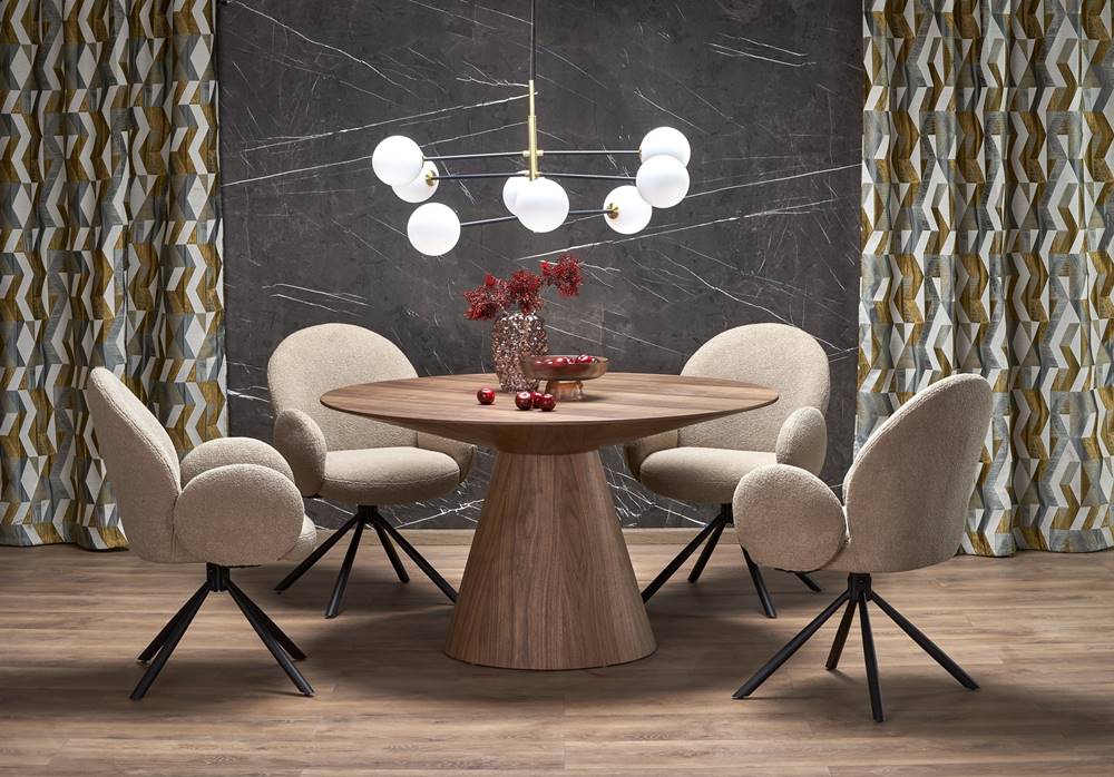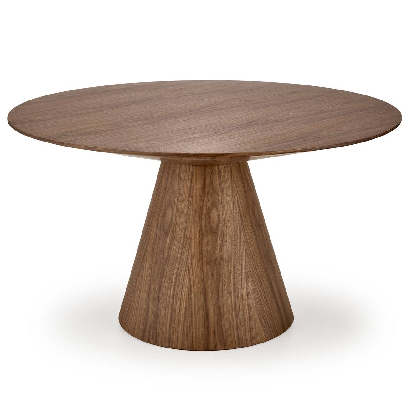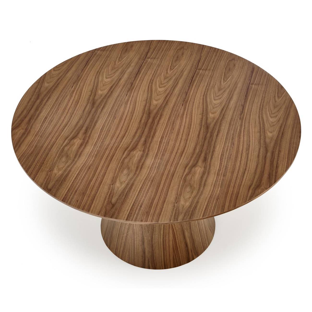 Стилна трапезна маса с голям кръгъл плот в цвят орех, Хендрикс.