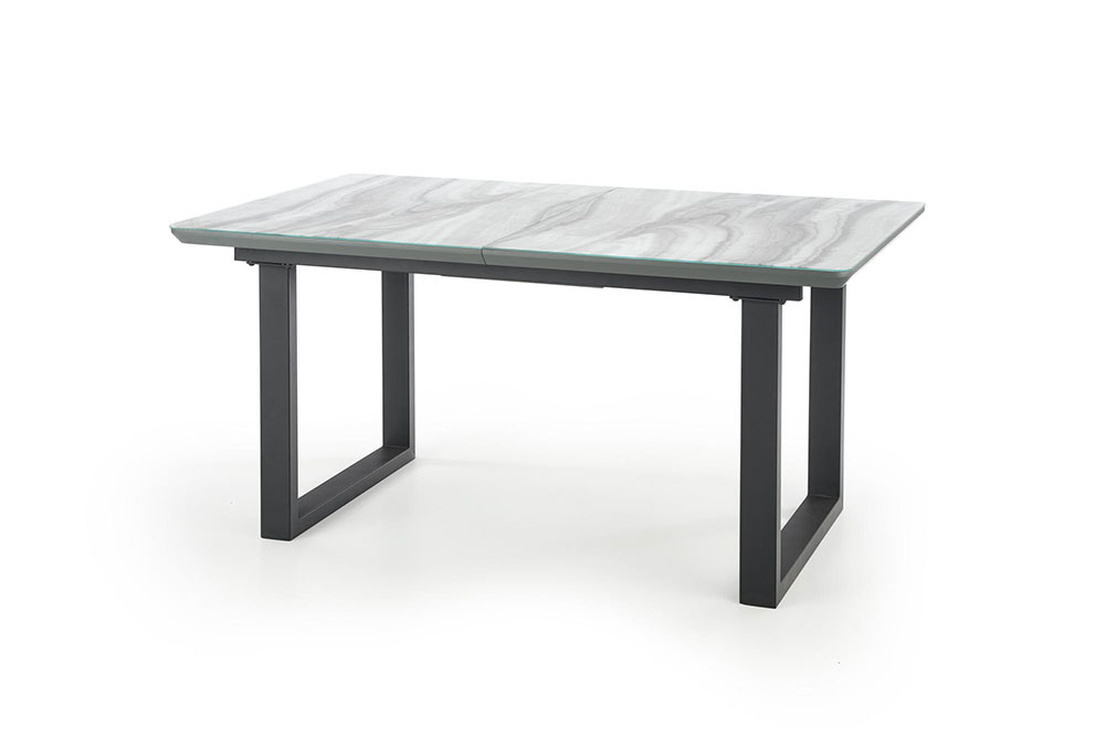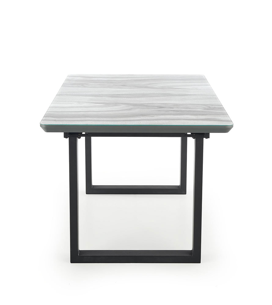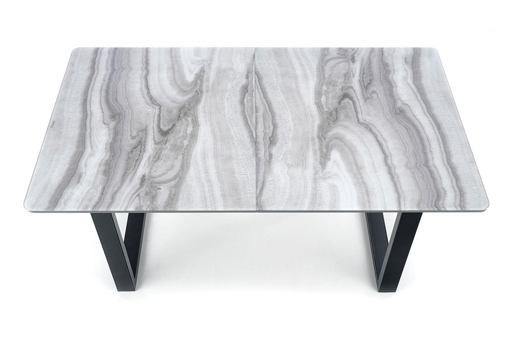Трапезна маса с правоъгълен МДФ плот като бял мрамор със стъклено покритие и разтегателна част в сиво върху черна метална основа.