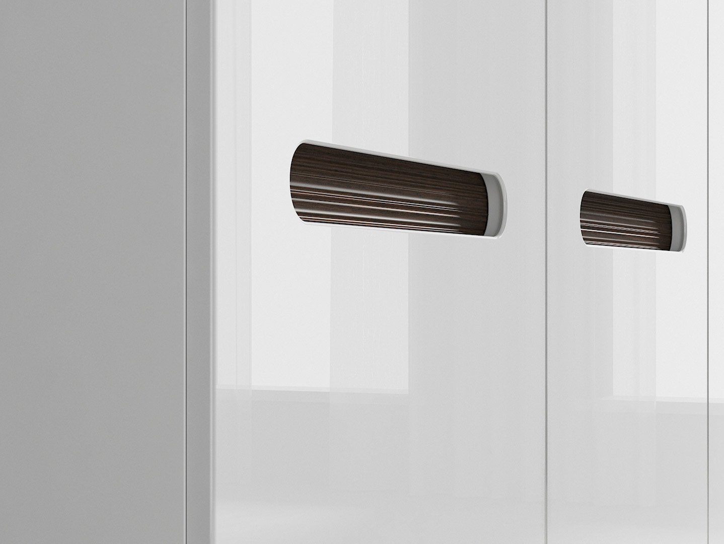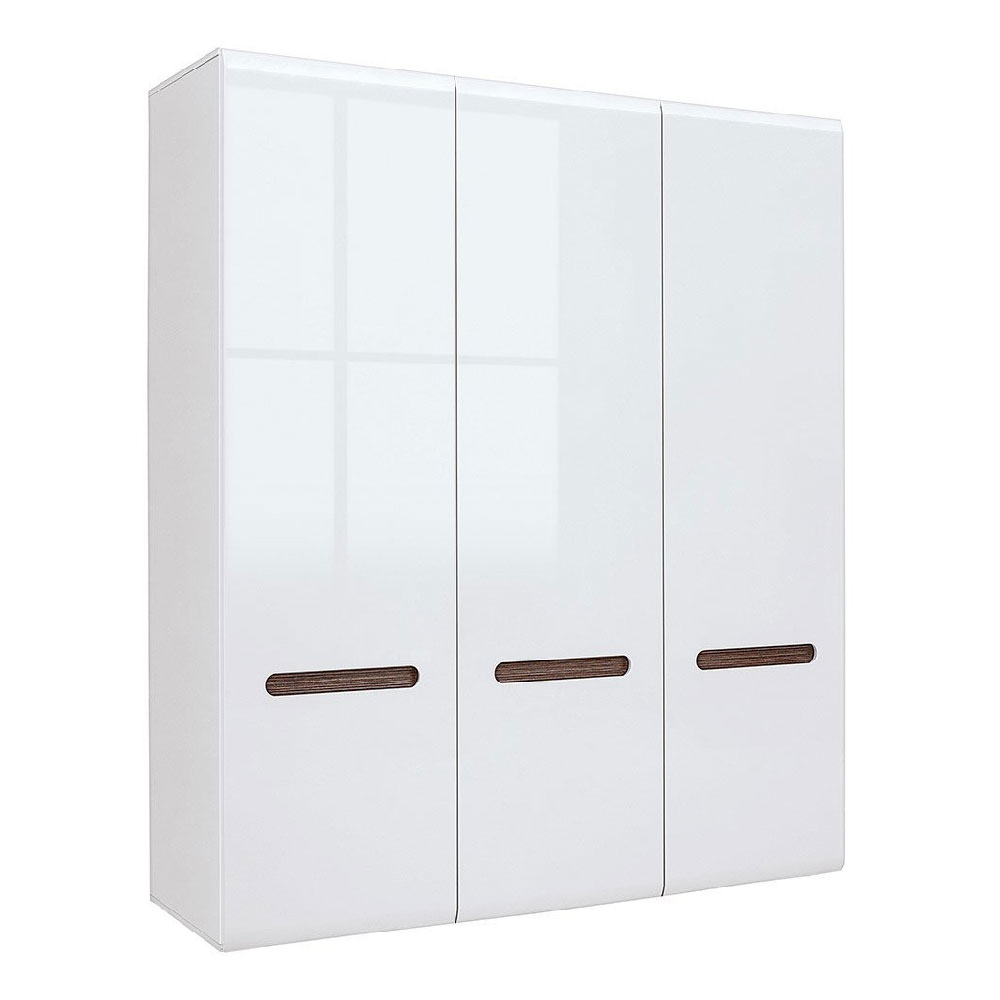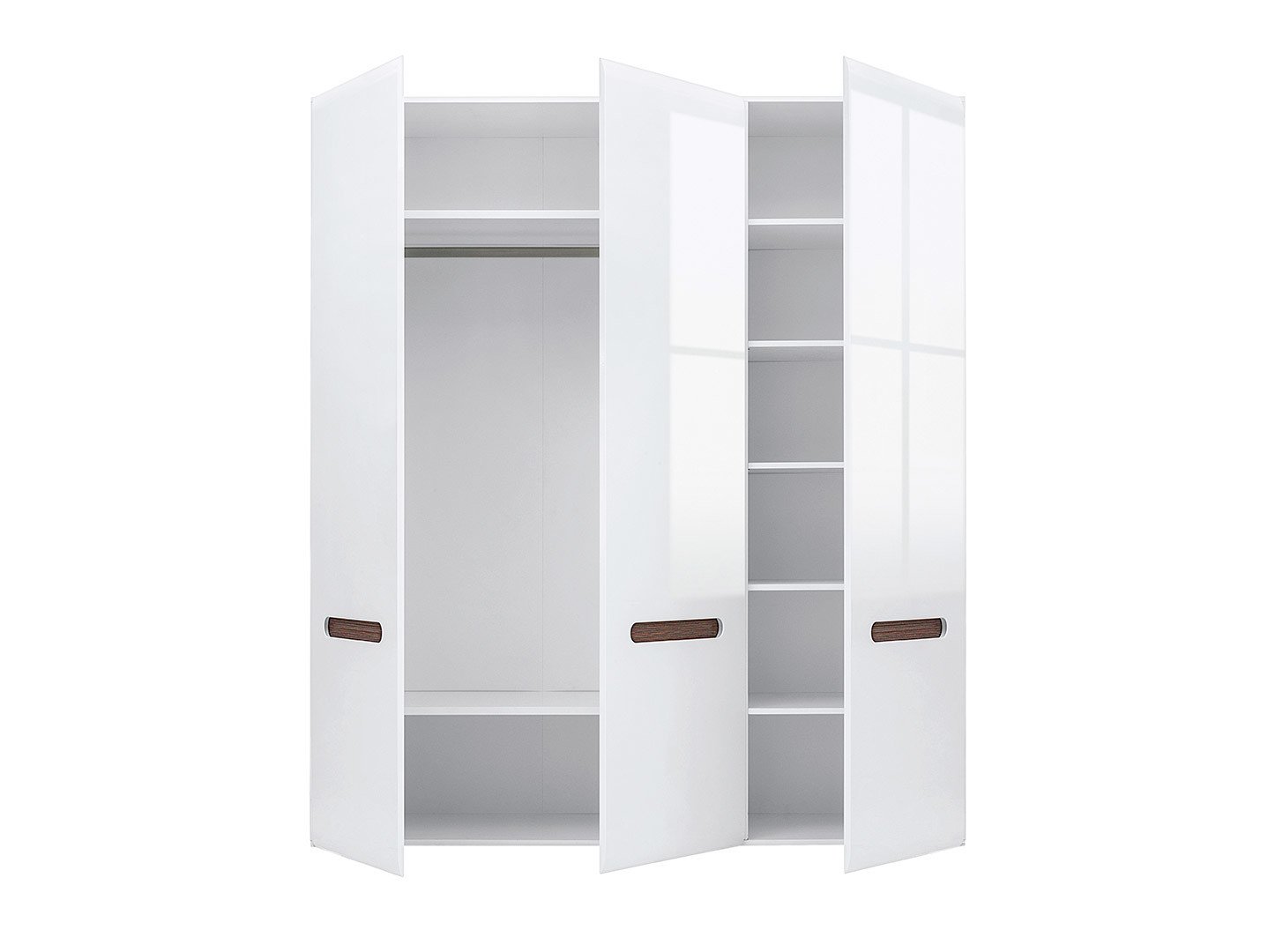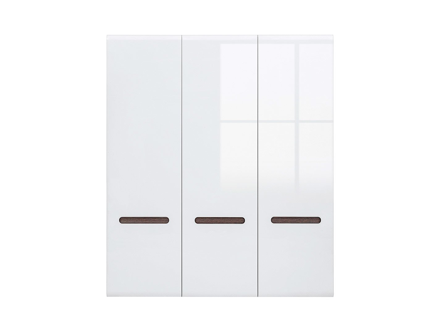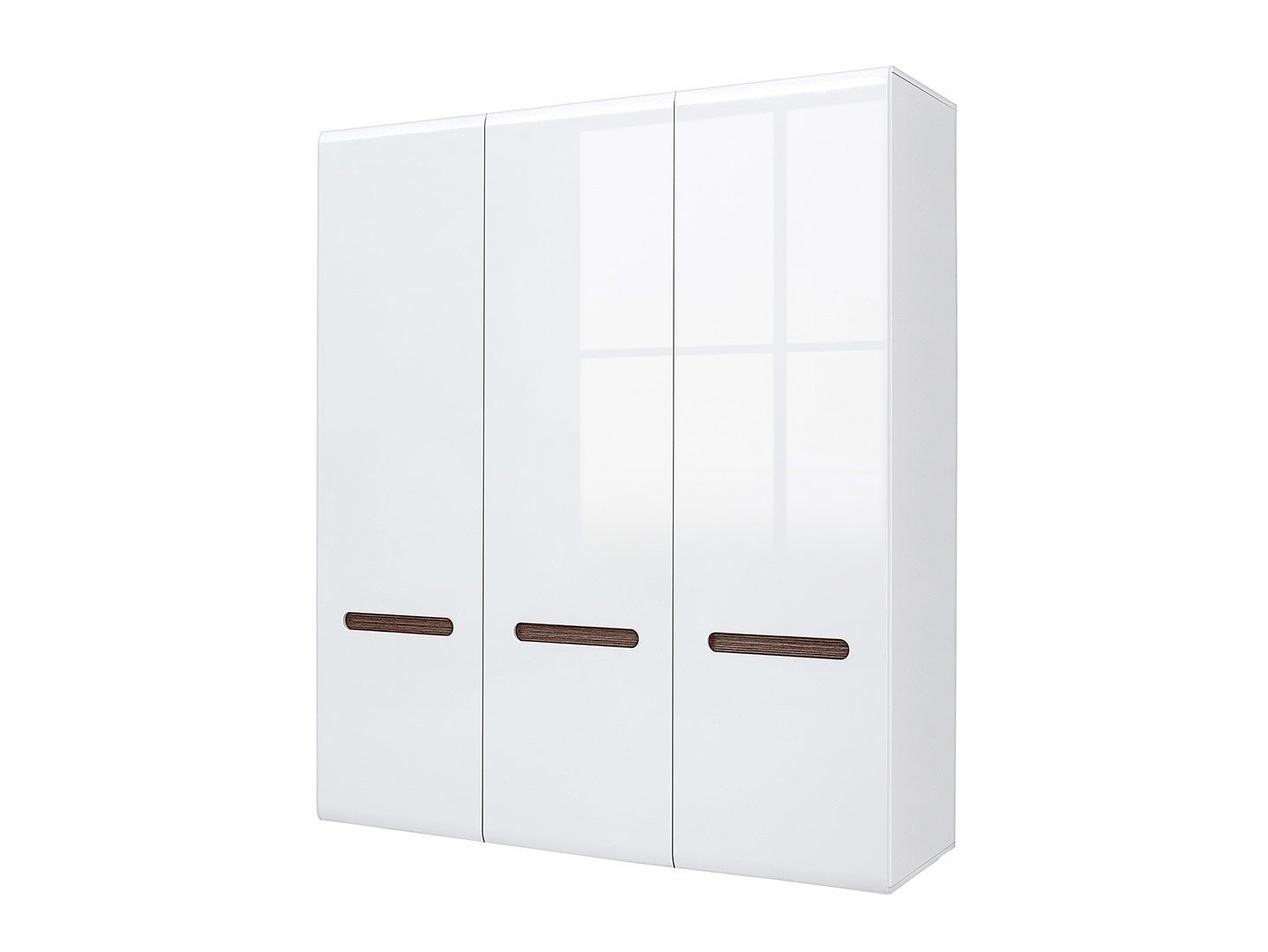 Трикрилен гардероб, изработен от ПДЧ и МДФ в бяло с гланцирана лицева част, модулна система Ацтека. Предлага се с две декоративни ленти – двустранна (бял или черен гланц) и едностранна в цвят венге.