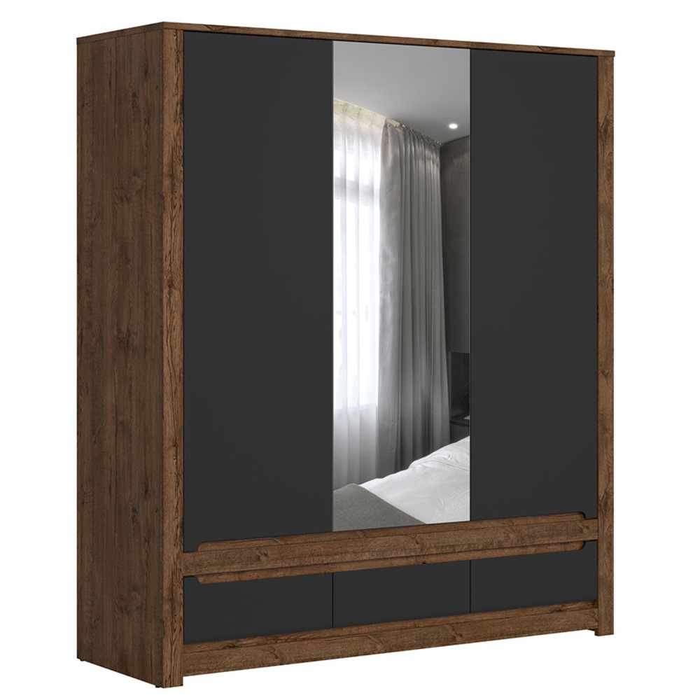 Трикрилен гардероб с огледало и три чекмеджета, изработен от ПДЧ в цветови комбинации дъб април и перлен гланц или дъб април с черен мат, модулна система Русо.