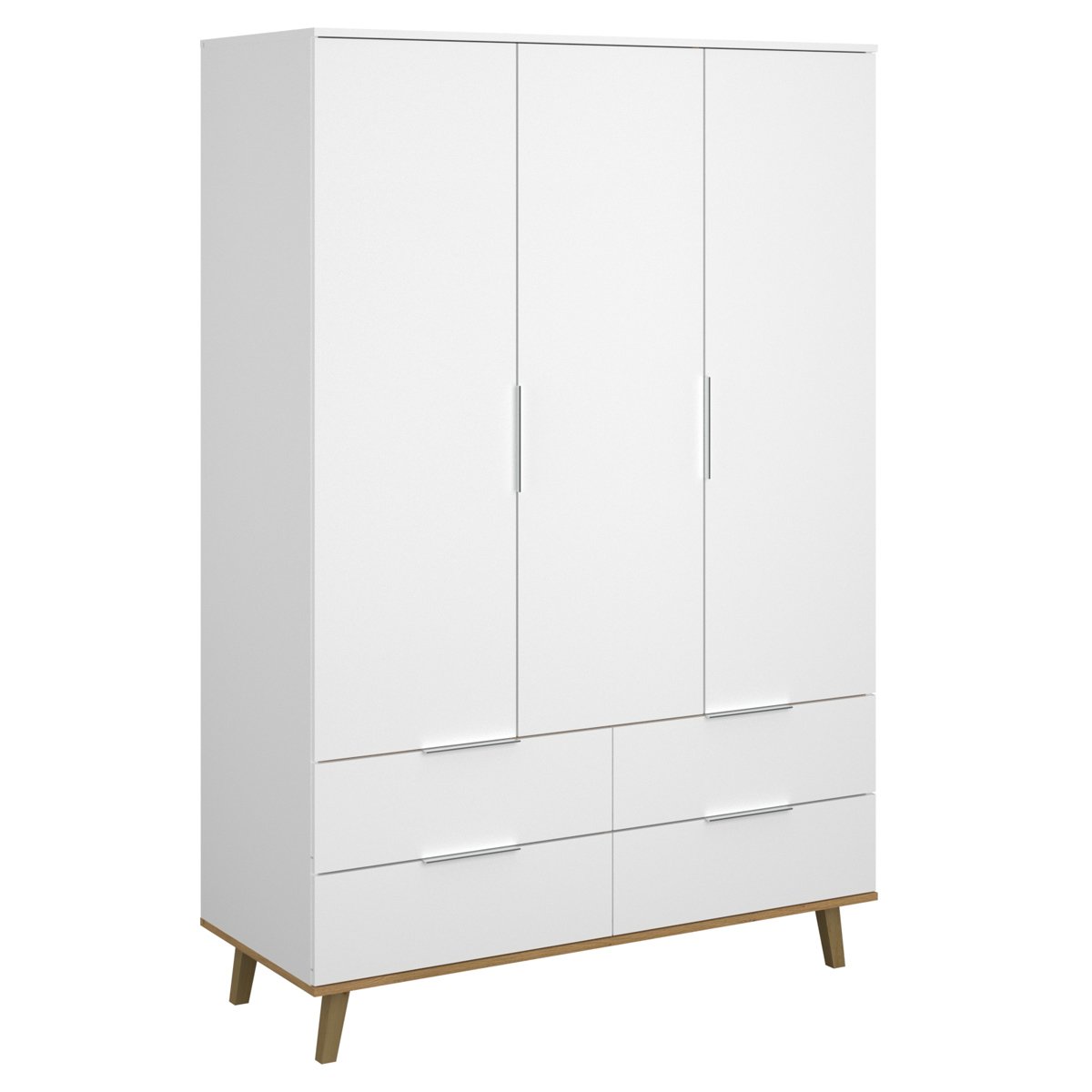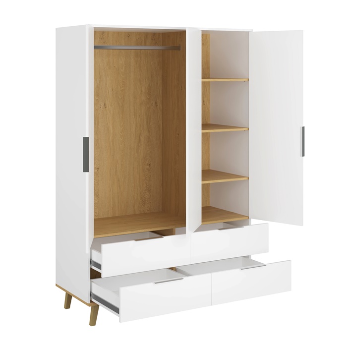 Трикрилен гардероб, изработен от ПДЧ в бял цвят с крачета от масивно дърво в цвят каменен дъб и елегантни дръжки, модулна система Нептун.