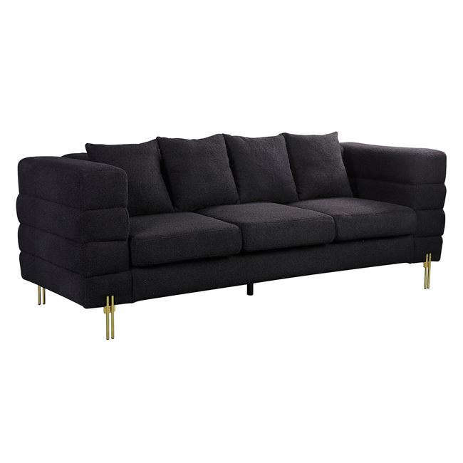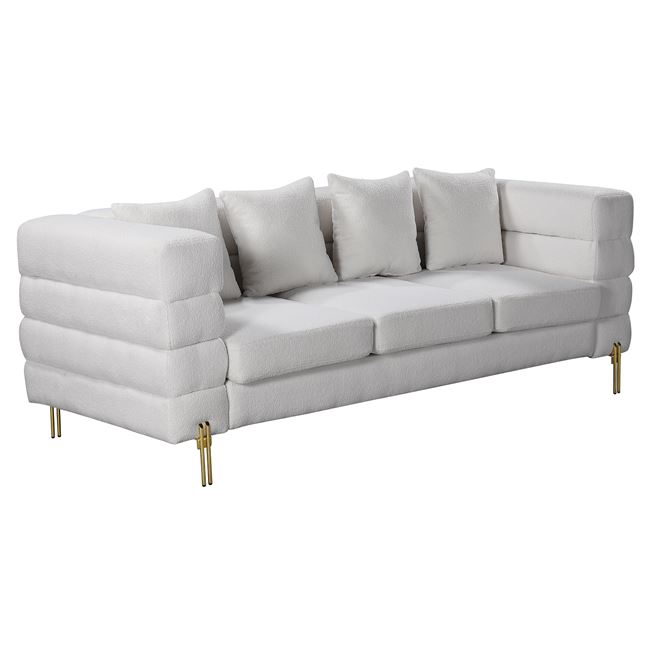 Елегантен триместен диван, изработен с текстилна дамаска от букле в бяло или черно и метални крачета в златист цвят.
