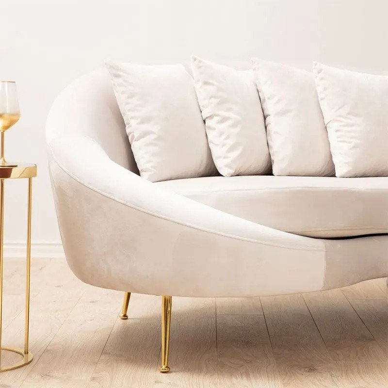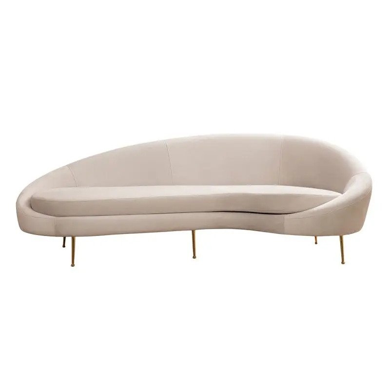 Атрактивен триместен диван, изработен с подсилена дървена рамка от буково дърво, мека текстилна дамаска в бежов цвят и красиви метални крачета в златисто.