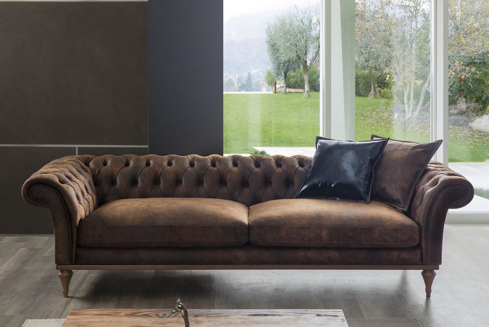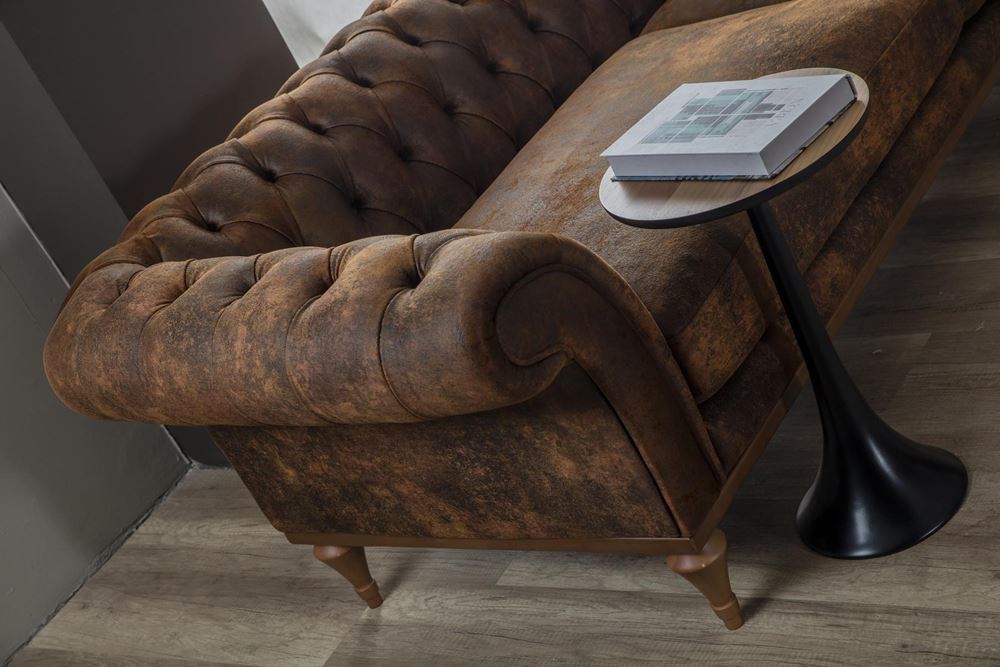 Елегантният триместен диван Fedes е изработен с тапицерия от текстилна дамаска в кафяв цвят и красива капитонирана облегалка в класическия стил Честърфийлд.