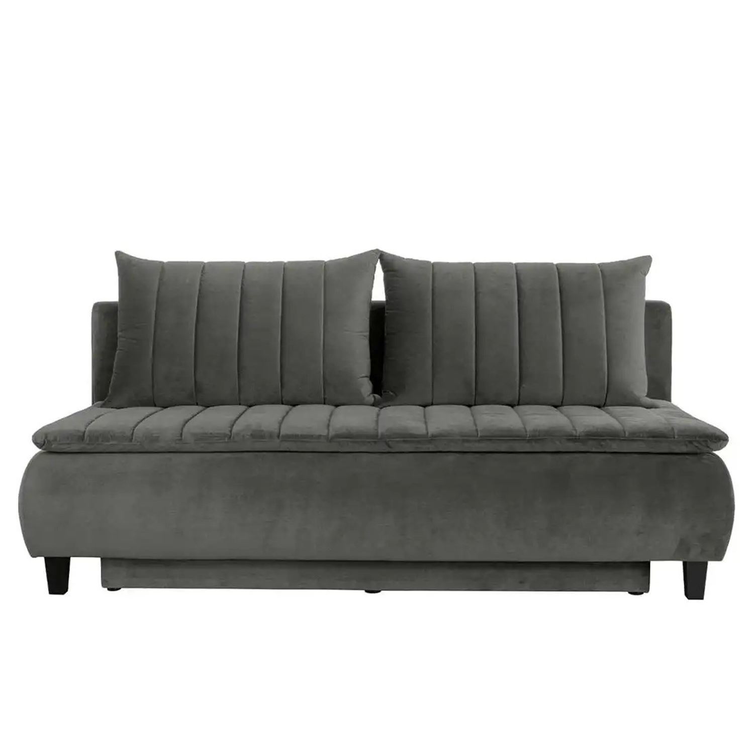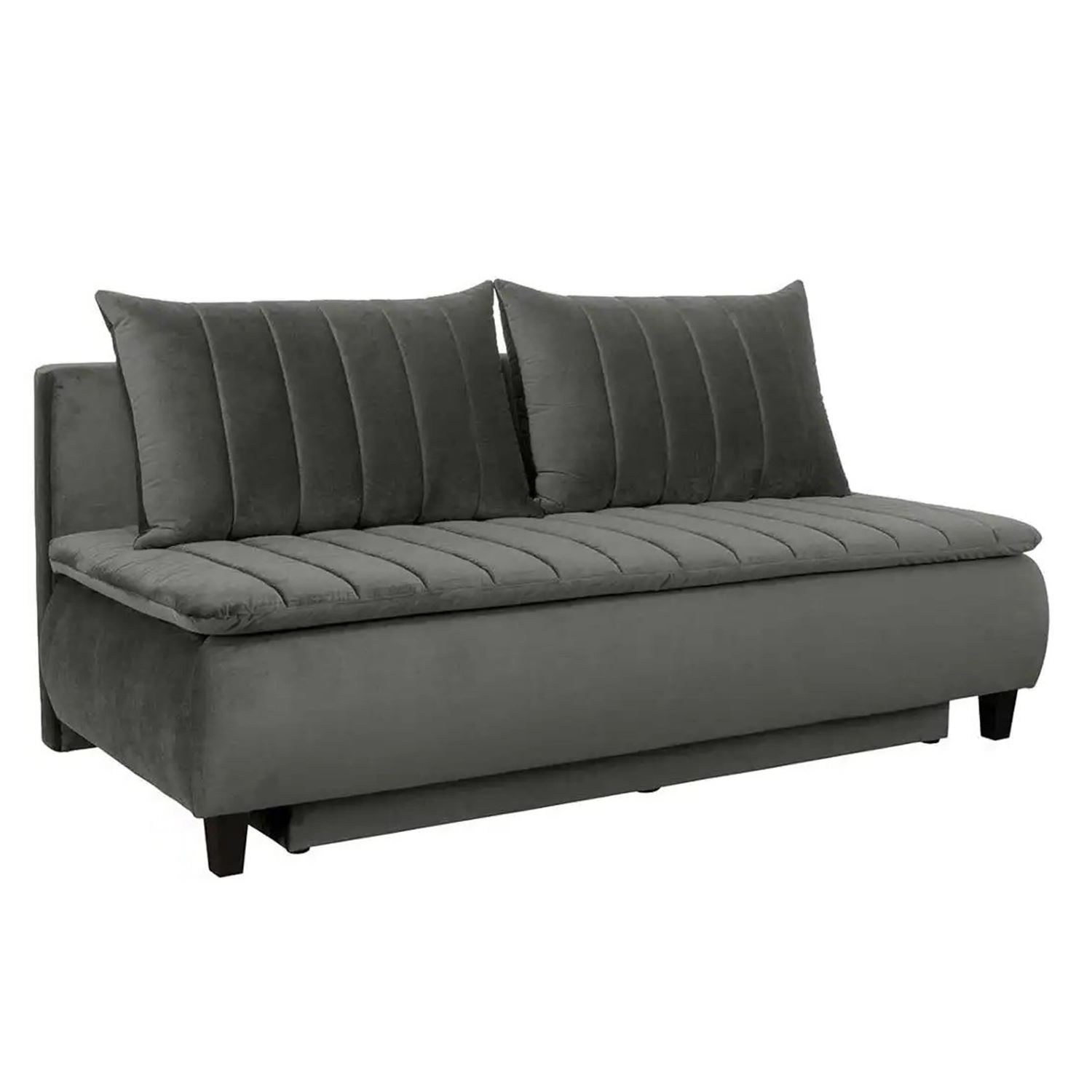 Този елегантен триместен сив диван съчетава модерен дизайн с практичност, като предлага функция за сън и вградена ракла за съхранение.
