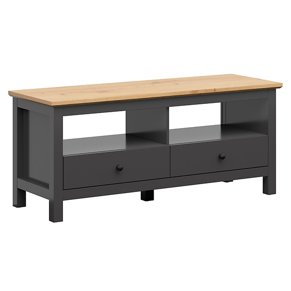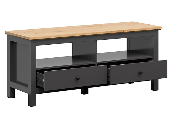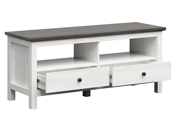 ТВ шкаф с две чекмеджета с кръгли дръжки и два открити рафта, изработен от ПДЧ, модулна система Хесен.
