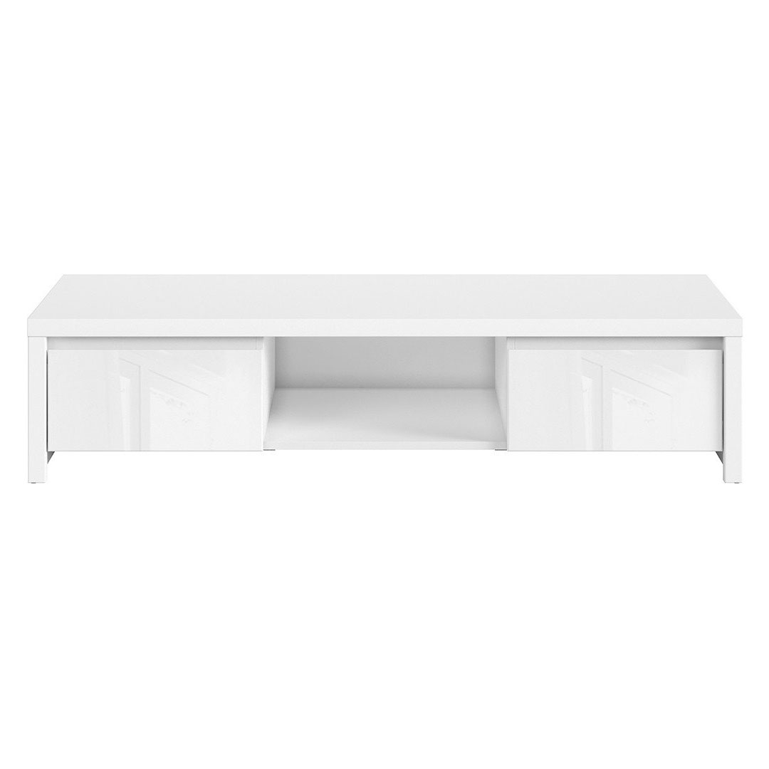 Бял ТВ шкаф от ПДЧ с две чекмеджета и открит рафт, модулна система Каспиан Бял, който се предлага в два варианта – с матирана повърхност или с гланцирани чекмеджета.
