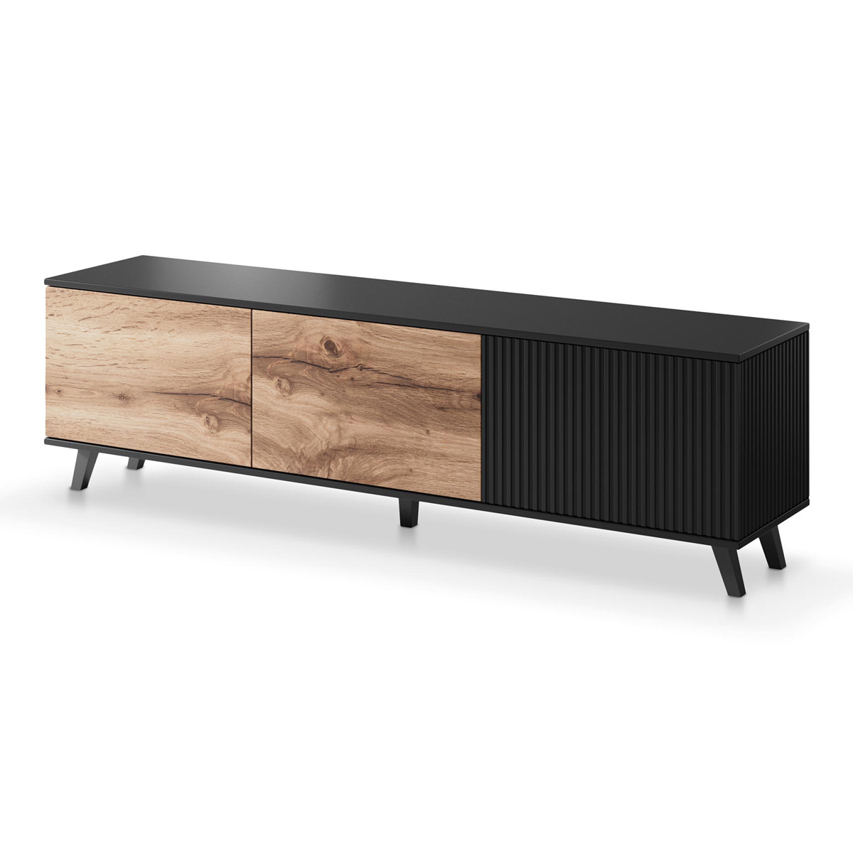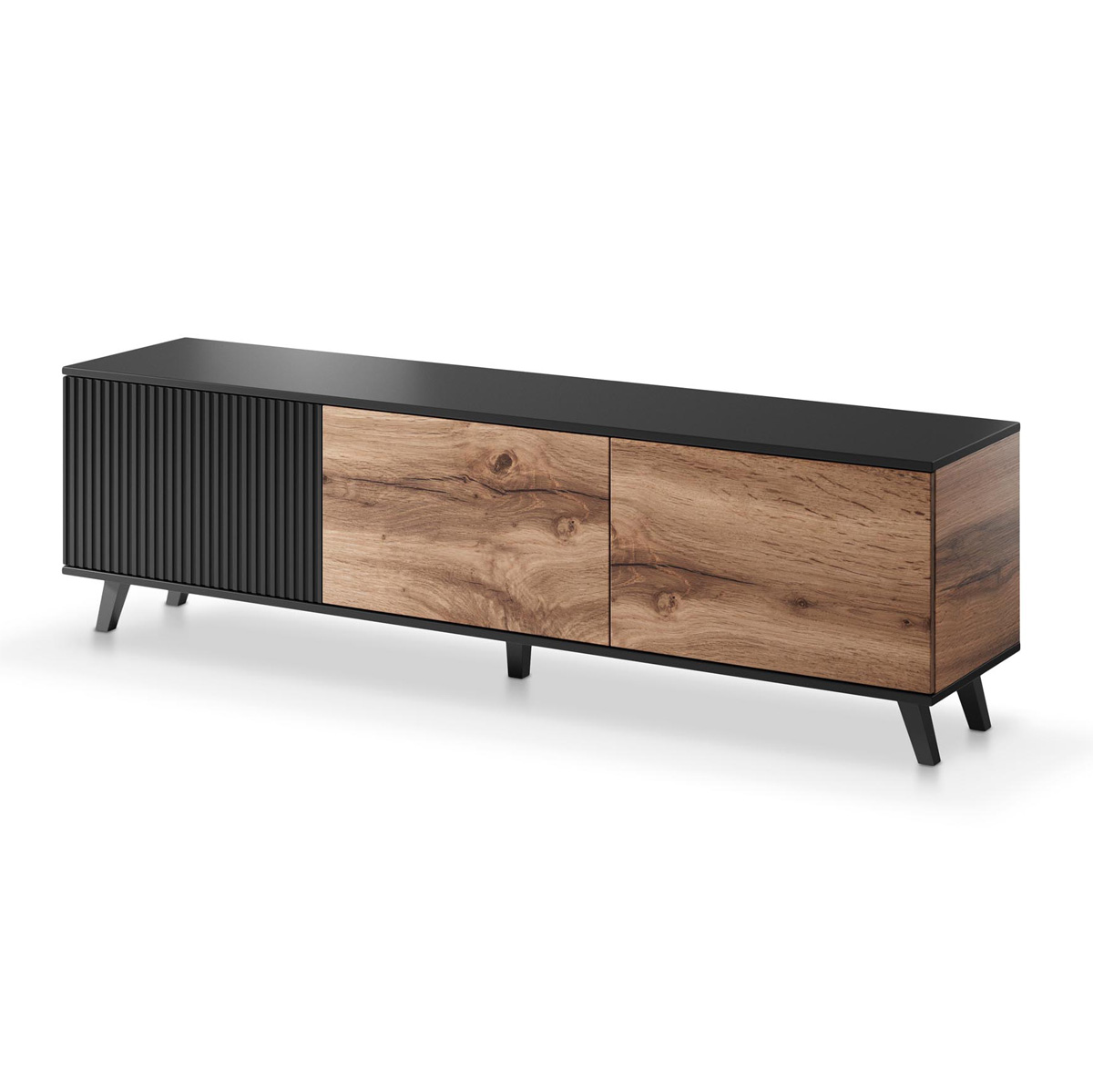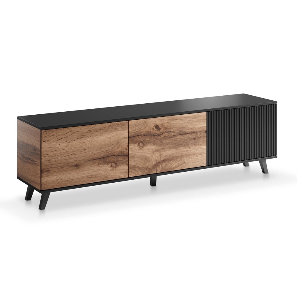 Модерен ТВ шкаф с релефен детайл, плот и крачета в черно, съчетани с дървесен цвят дъб вотан, модулна система Рандъм.