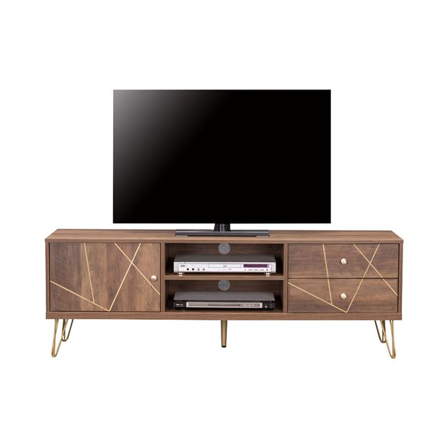 Стилен ТВ шкаф, изработен от ПДЧ с меламиново покритие в цвят орех и интересна основа със златисти детайли, серия Катрин. Разполага с правоъгълен плот, два рафта, две чекмеджета и вратичка за съхранение на лични вещи.