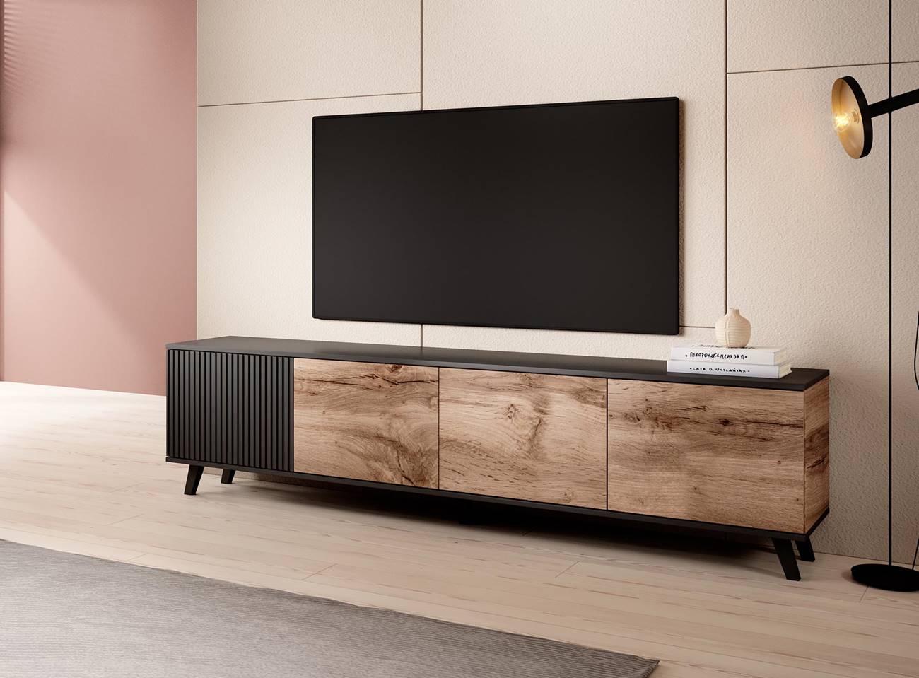 Модерен ТВ шкаф в дъб вотан и черно, с релефен детайл, модулна система Рандъм.