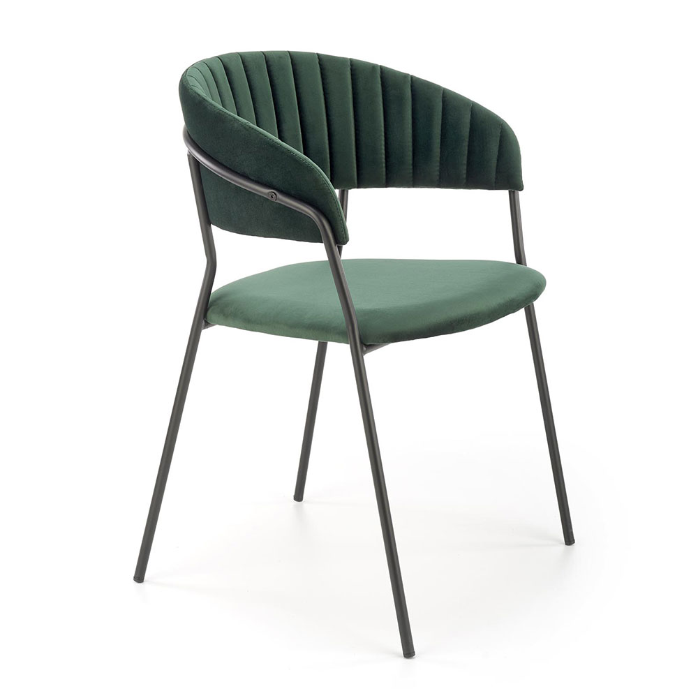 Удобен трапезен стол с облегалка и седалка от кадифе, подлакътници и черна основа от метал.