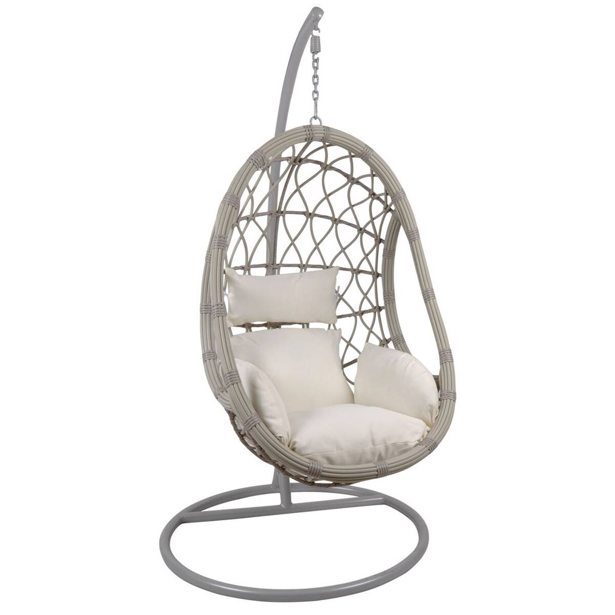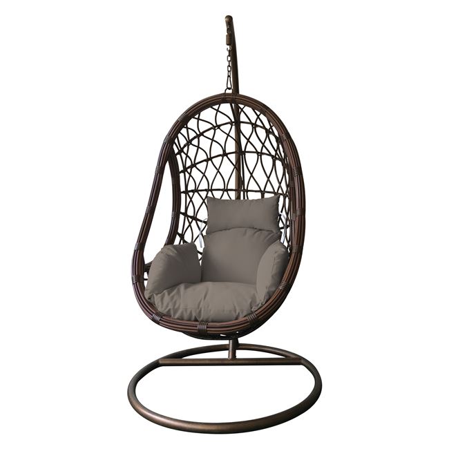 Висяща градинска люлка от сив или кафяв синтетичен ратан с възглавници в цвят бяло или капучино Есмара, която се предлага в три цветови комбинации.