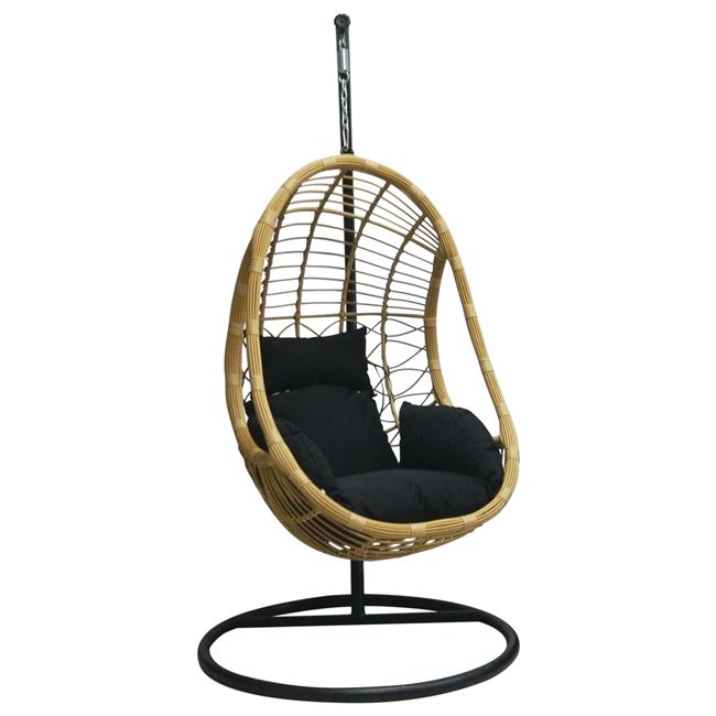 Висящо кресло за градина или балкон тип яйце, изработено от синтетичен ратан в бежово и черна метална рамка.