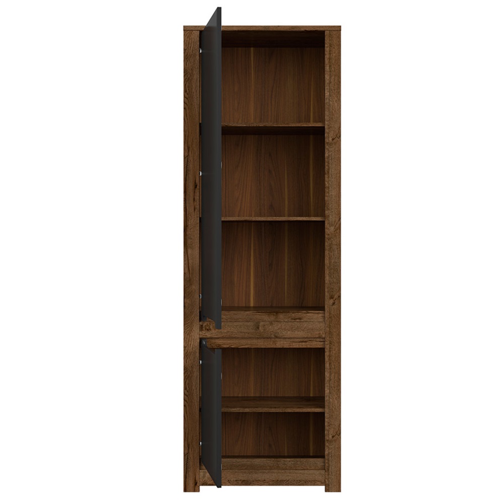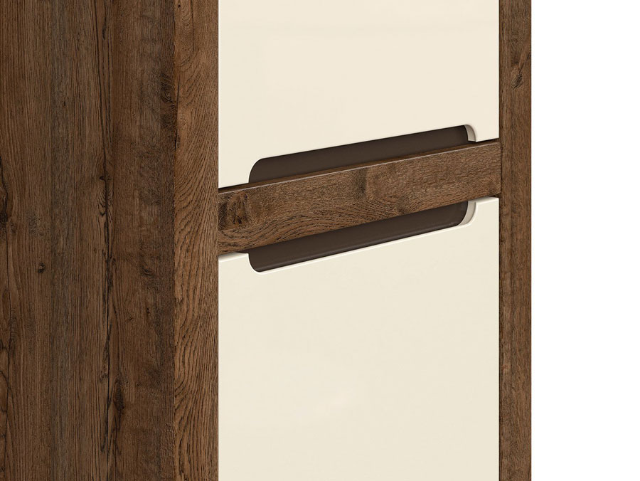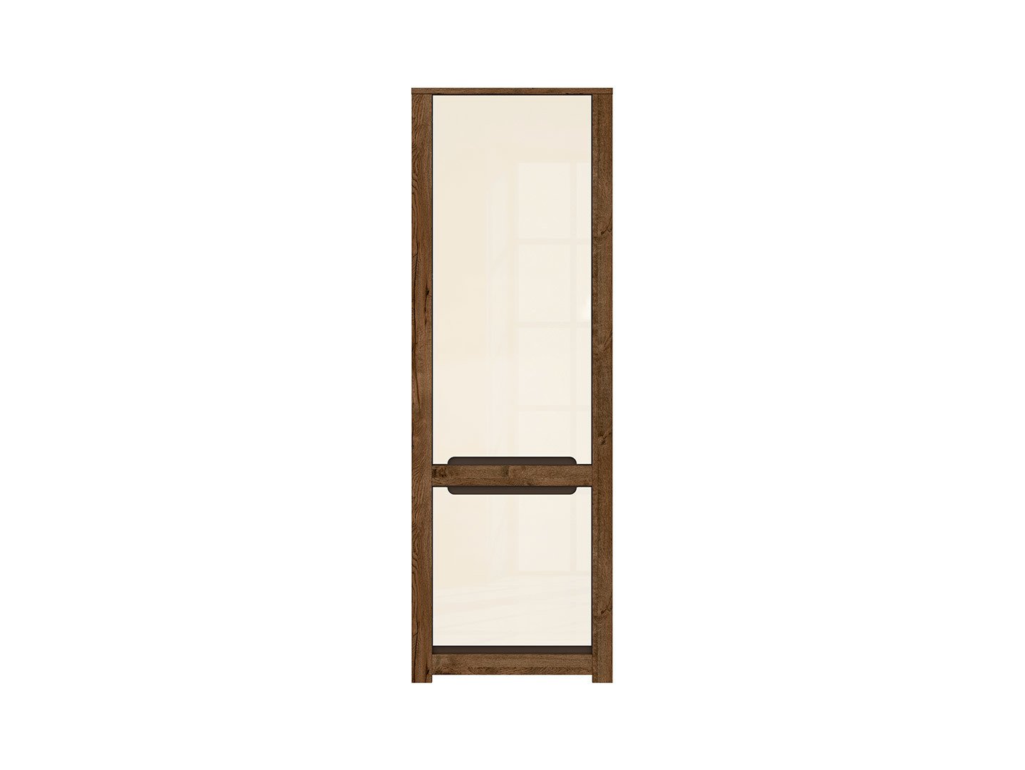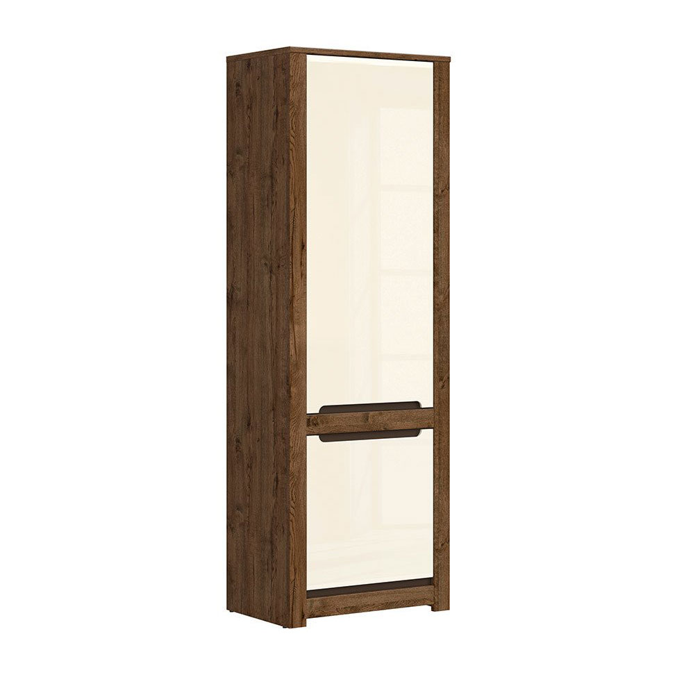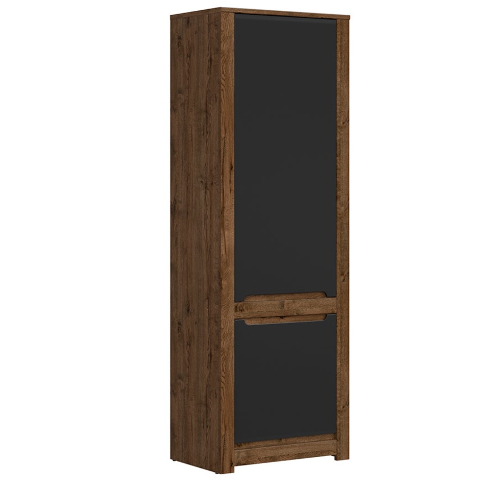 Висок шкаф, изработен от ПДЧ и МДФ с корпус в цвят дъб април и две врати в перлен гланц или черен мат, модулна система Русо.