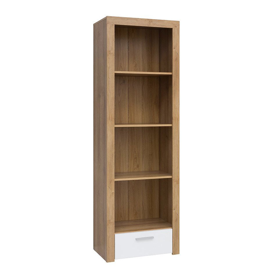 Висок шкаф с четири открити рафта, изработен от ПДЧ и МДФ с корпус в цвят дъб ривиера и бяло гланцирано чекмедже със сребриста дръжка, модулна система Балдер.