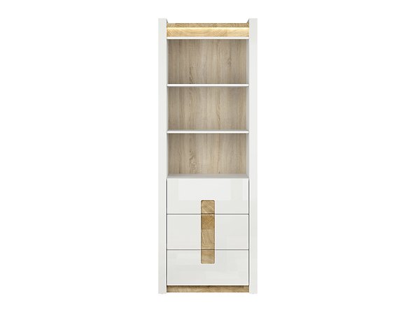 Висок шкаф в бял гланц с детайли и гръб в цвят уестминстърски дъб, три открити рафта, три чекмеджета и вградено LED осветление в горната част, модулна система Аламеда.